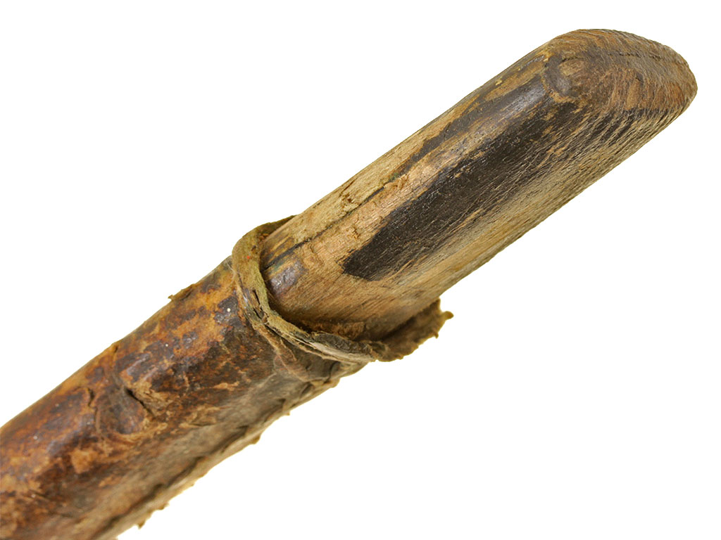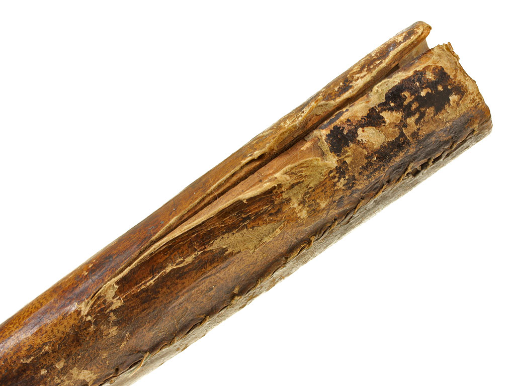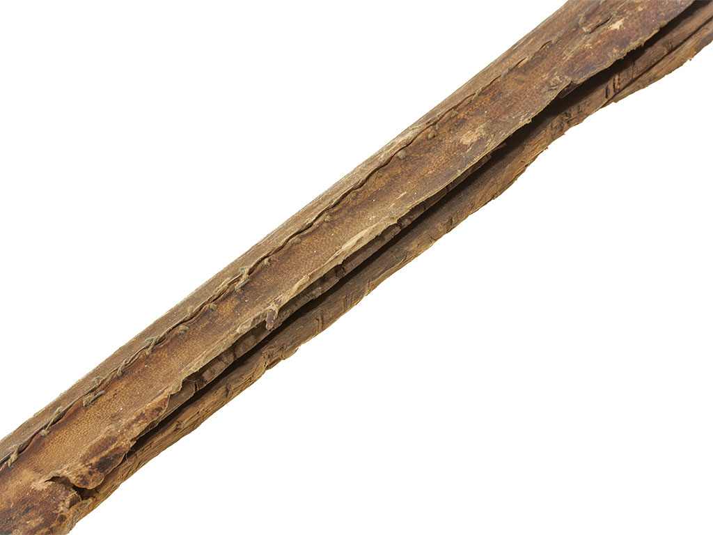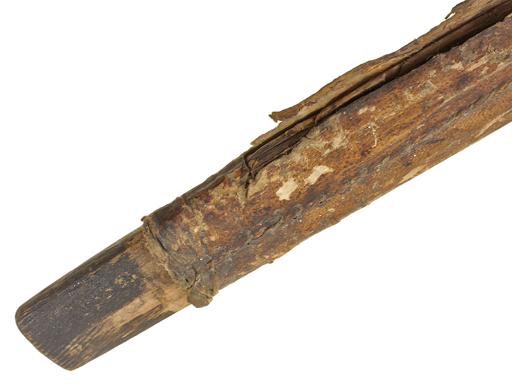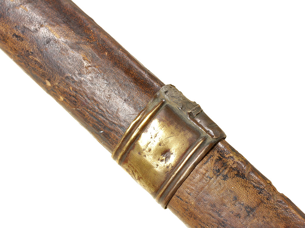 Оригинальные ножны для кавказской шашки, изготовленные в конце XIX века. Деревянная основа ножен обтянута коричневой кожей, у основания имеется расширение (шашка утапливалась в ножнах с рукоятью, на азиатский манер). Сохранилась латунная гайка, наконечник ножен отсутствует. Ножны изготовлены под клинок незначительной кривизны.