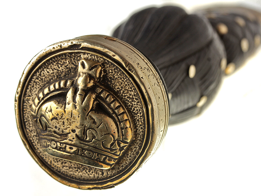 Рукоять изготовлена из черного дерева, покрыта резьбой, имитирующей узловатое плетение. Верхняя и нижняя обоймицы изготовлены из белого металла. Головка рукояти утолщенная, завершается рельефным изображением королевской короны.