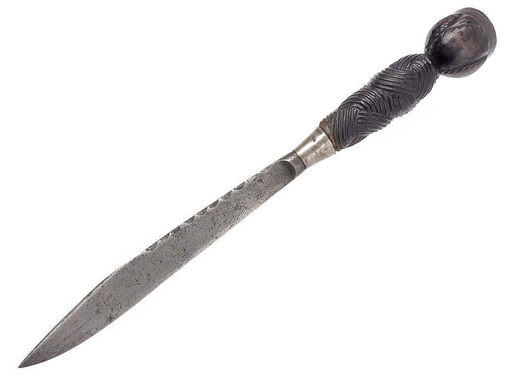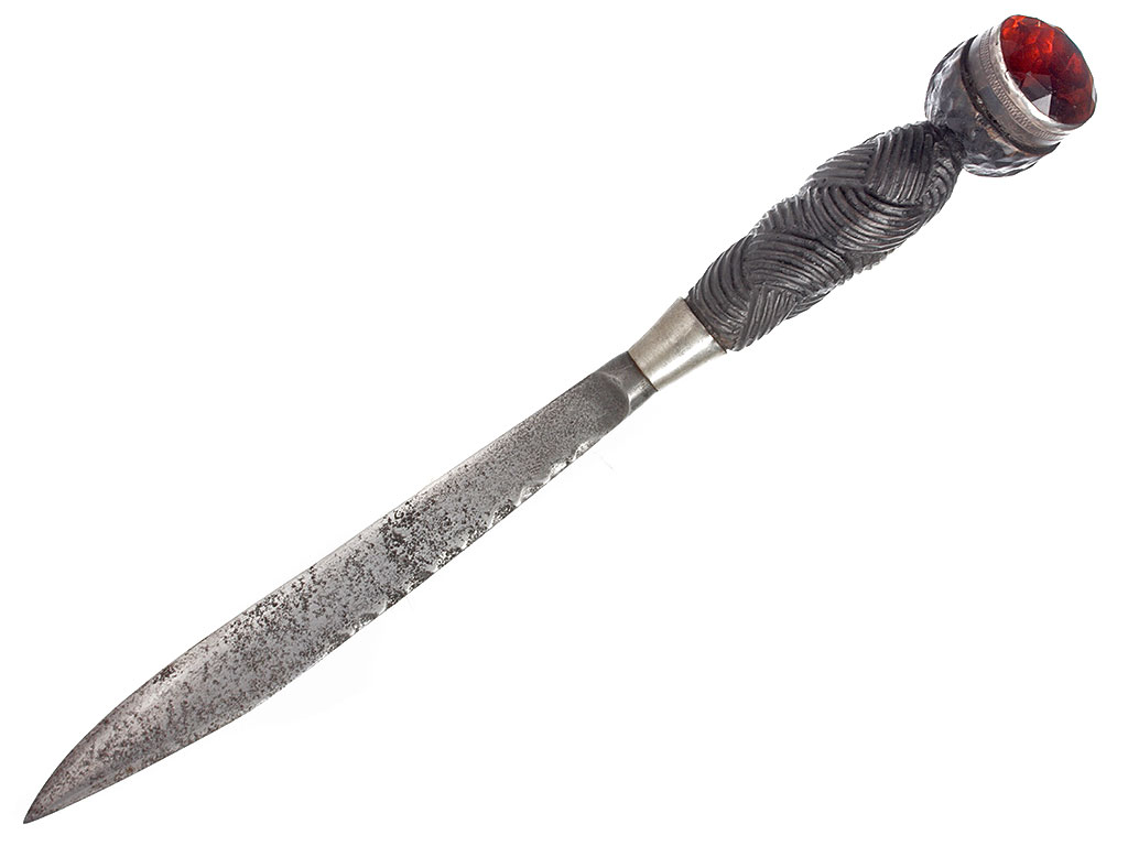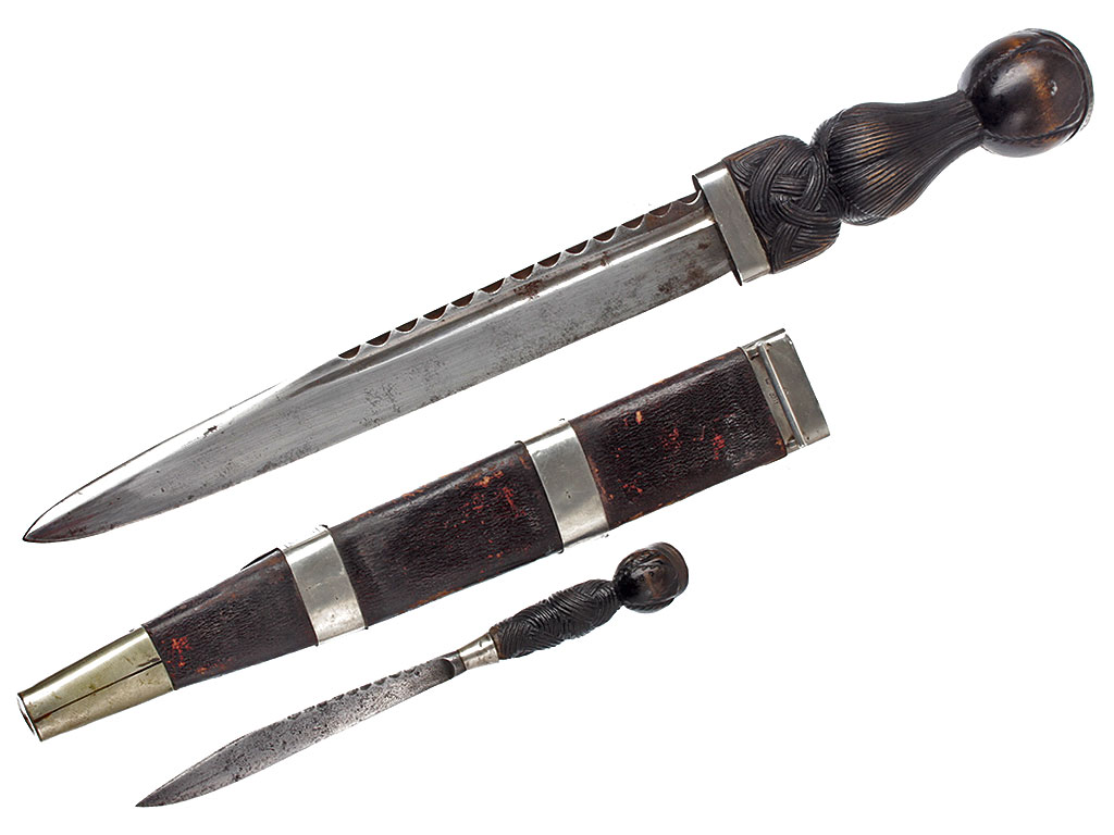 Традиционный шотландский кинжал - дирк, изготовленный в начале ХХ века, неотъемлемая принадлежность офицеров шотландских полков. Клинок прямой, однолезвийный (боевой конец двулезвийный), с коротким узким долом; обух клинка в верхней части волнистый. Без клейм.