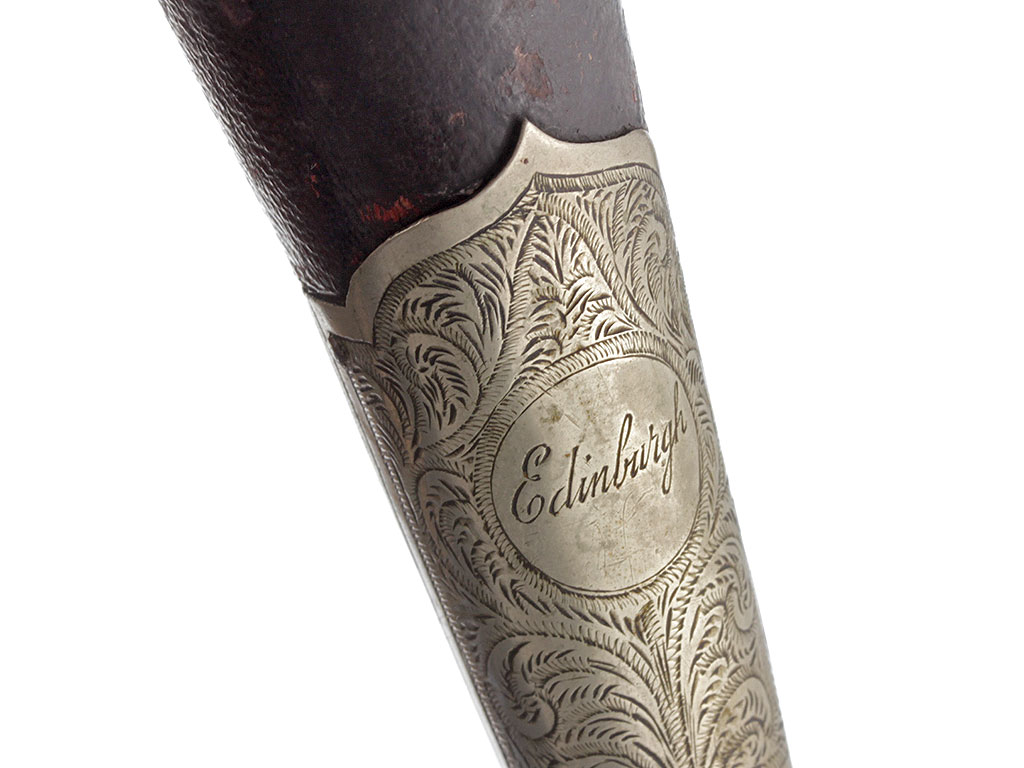 Ножны деревянные, обтянутые черной кожей, с серебряным прибором. Украшенный тонкой гравировкой серебряный прибор ножен состоит из устья, двух обоймиц и наконечника. Обоймицы расположены на утолщениях с гнездами, в верхнее из которых вставлен миниатюрный нож, а в нижнее должна была вставляться такая же вилка (утрачена). Миниатюрный нож, по сути, является уменьшенной копией самого кинжала и украшен в том же стиле. В центре всех элементов убранства ножен с лицевой стороны помещены круглые медальоны, в которые заключена дарственная надпись: "PRESENTED TO №2 BRANCH / PIPE BAND II.9.19 BY / CAPTAIN R.BAIHGATE / EDINBURGH". С нутренней стороны на устье скоба для ремня. Под скобой - пробирные клейма.