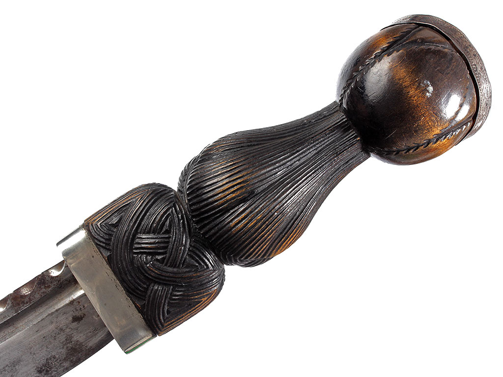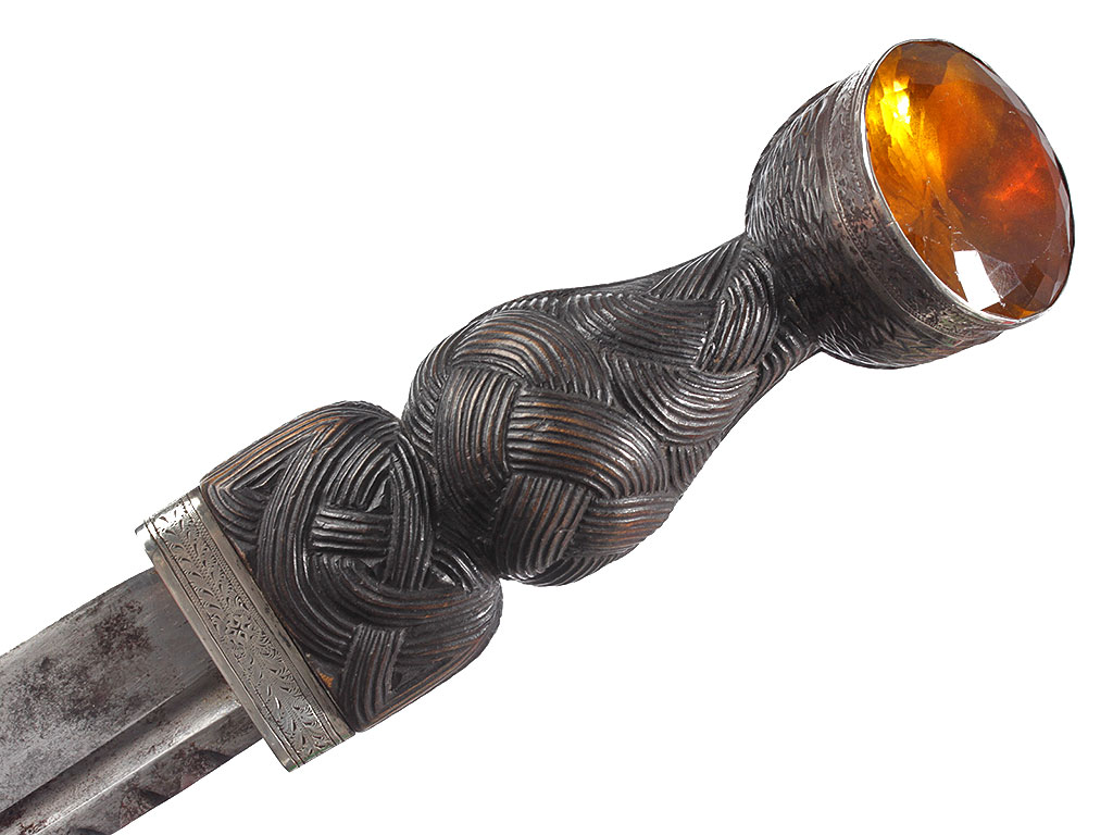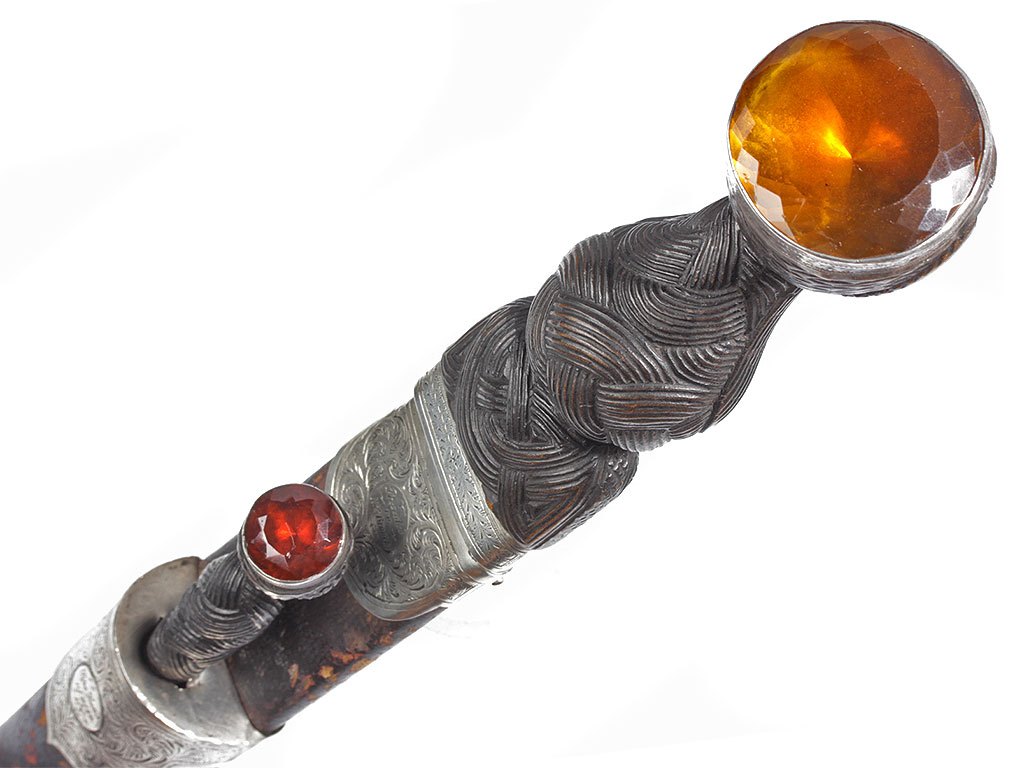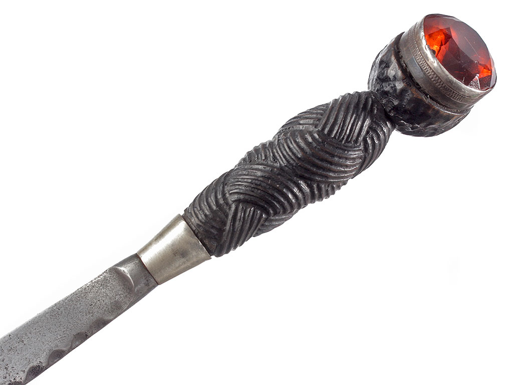 Рукоять изготовлена из черного дерева, покрыта резьбой, имитирующей узловатое плетение. Верхняя и нижняя обоймицы изготовлены из серебра и украшены тонким гравированным орнаментом. Головка рукояти утолщенная, завершается вставкой из граненого стеклянного кристалла янтарного оттенка.