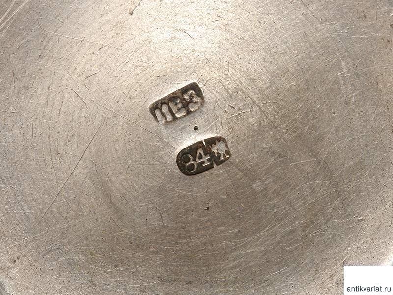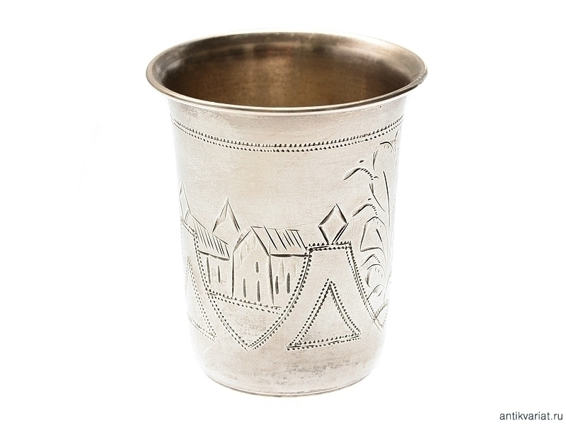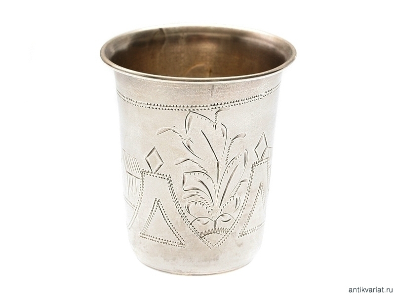 Серебряная чарка для спиртных напитков, украшенная гравированным орнаментом. На донышке имеются клейма мастера и Киевского пробирного надзора. Начало ХХ века. Очень хорошее состояние.