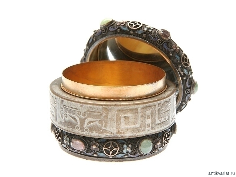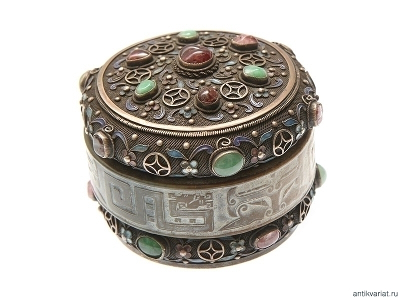 Серебряная шкатулка, изготовленная в ацтекском стиле. Украшена каменным резным ободком и декоративными поделочными камнями.