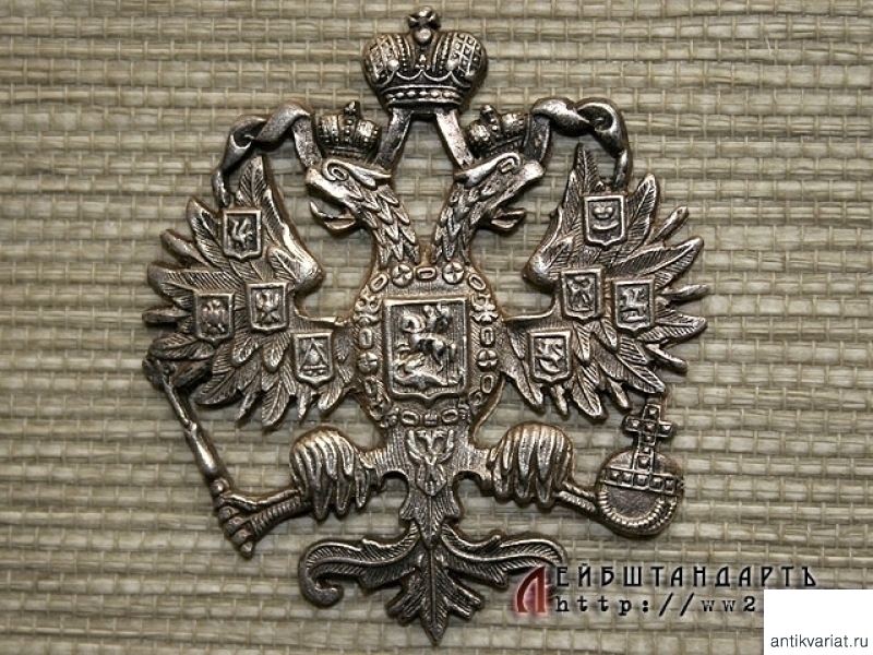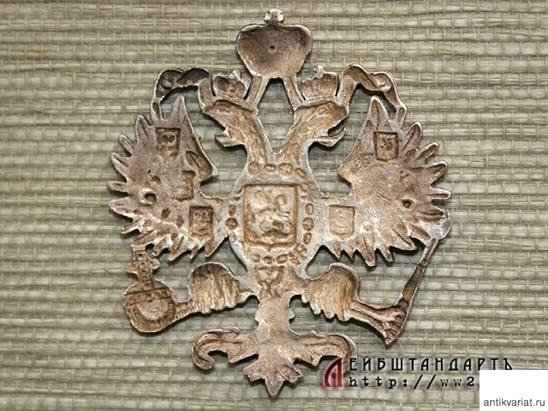 Накладка в виде двуглавого орла, изготовленная из серебра способом литья.
