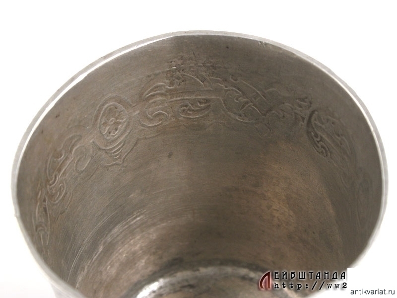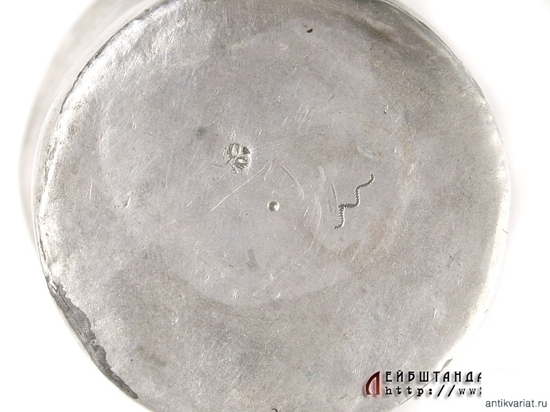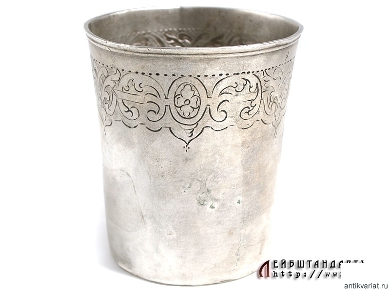 Небольшой, высотой 7 см. серебряный стакан, украшенный ручной гравировкой в виде двуглавого орла с вензелем Императрицы Елизаветы II на нагрудном щите. На донышке имеются клейма - так называемое "тремоло", которое оставлял пробирный мастер, и миниатюрное клеймо в виде двуглавого орла. Судя по работе и клеймам, данный предмет можно датировать серединой XVIII века.