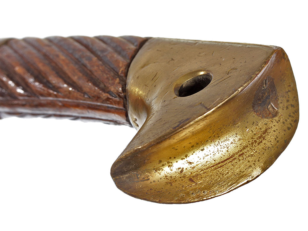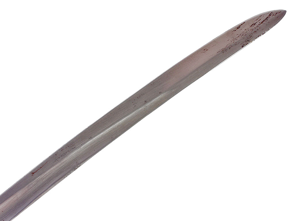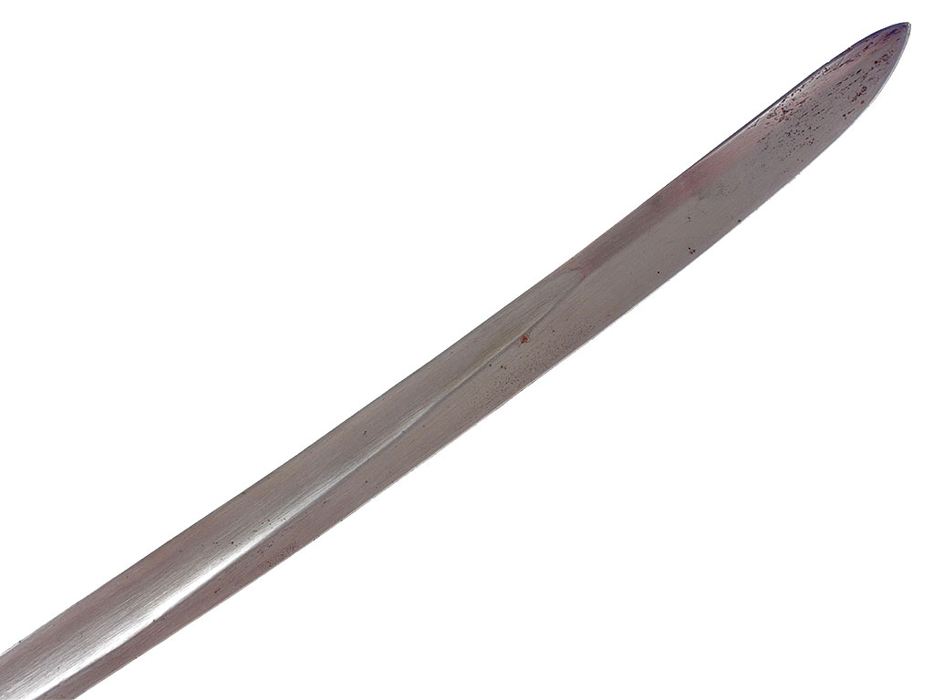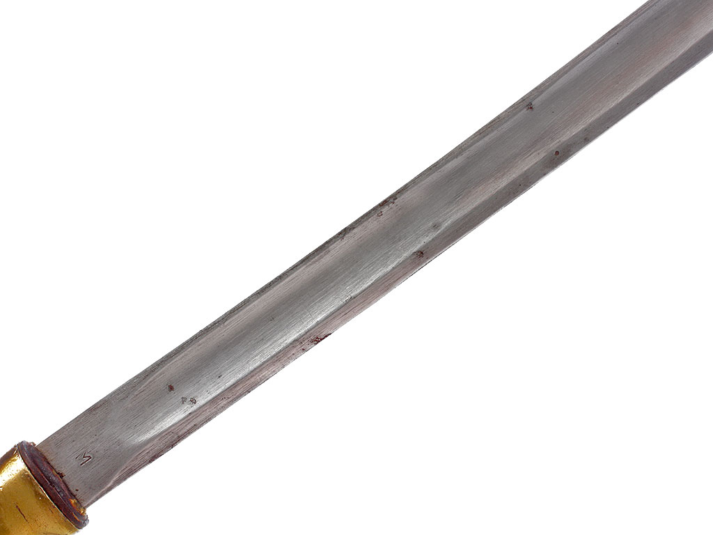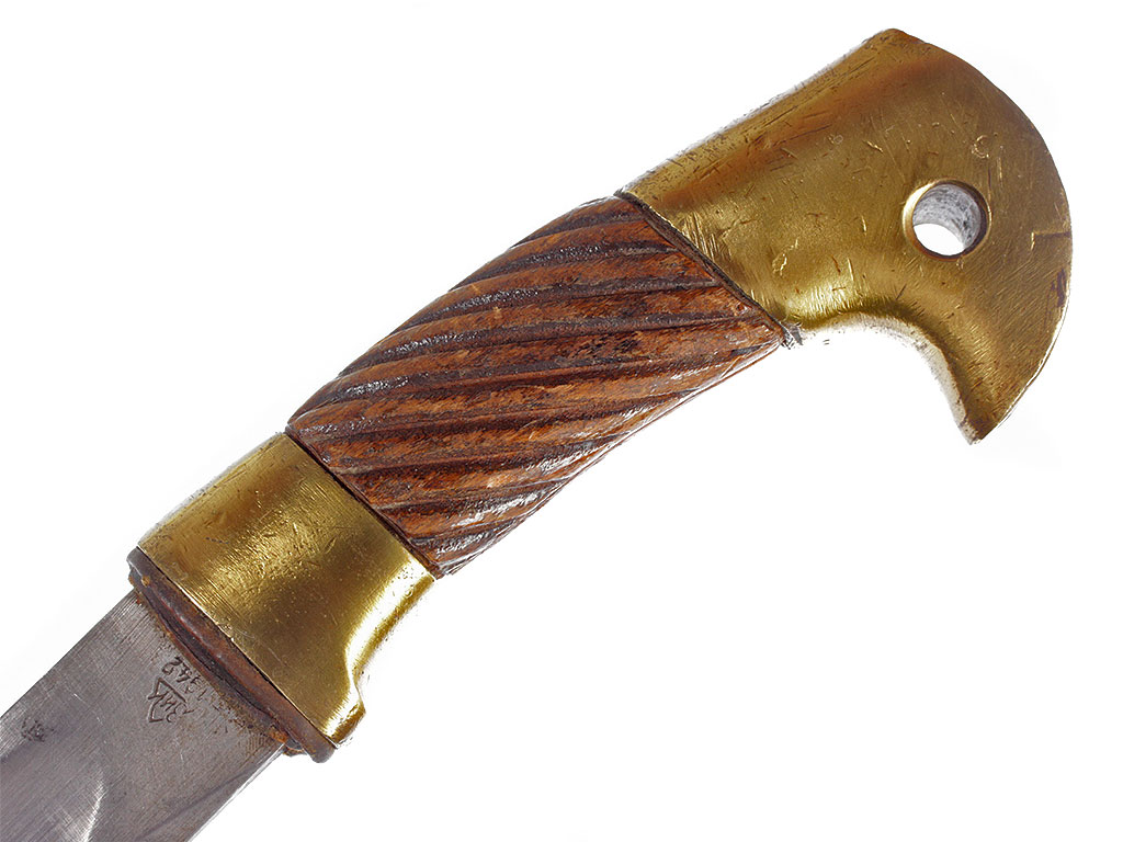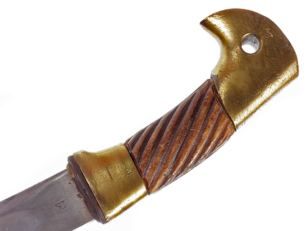 Шашка кавалерийская для красноармейцев и младших командиров выпуска 1942 года. Клинок незначительной кривизны, с одним широким долом, с незначительными следами затачивания, у основания клеймо Златоустовского инструментального комбината с годом выпуска. Рукоять деревянная, с латунными навершием и втулкой. Ножны отсутствуют.