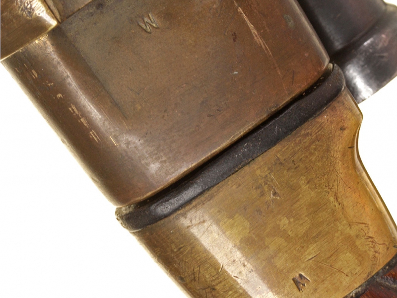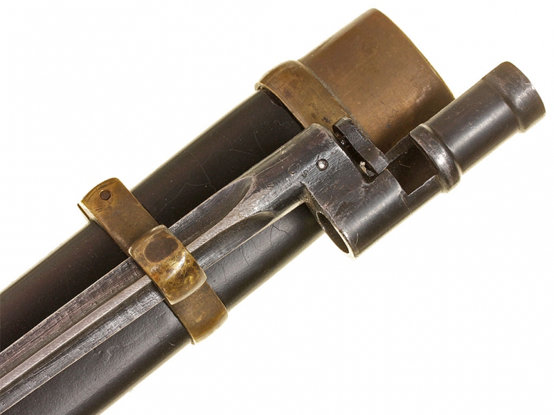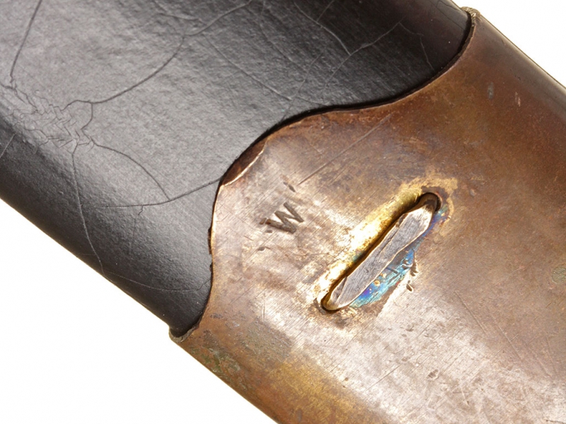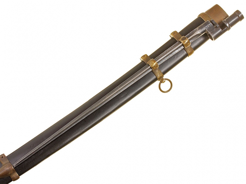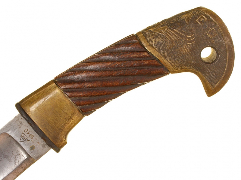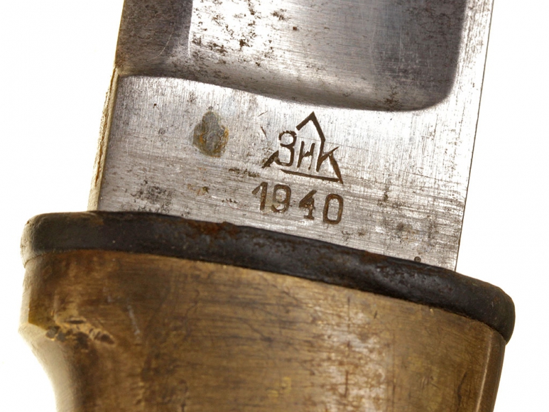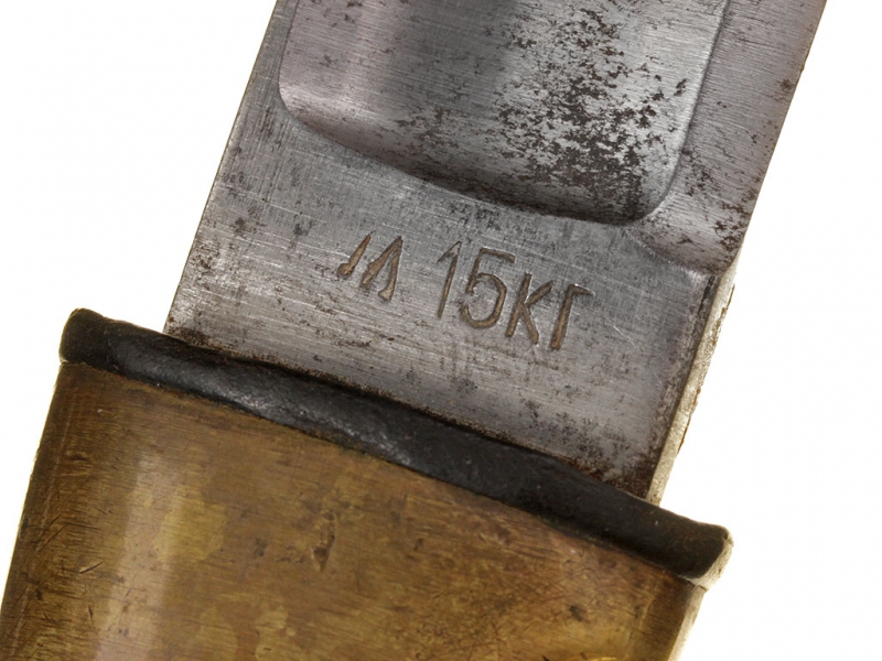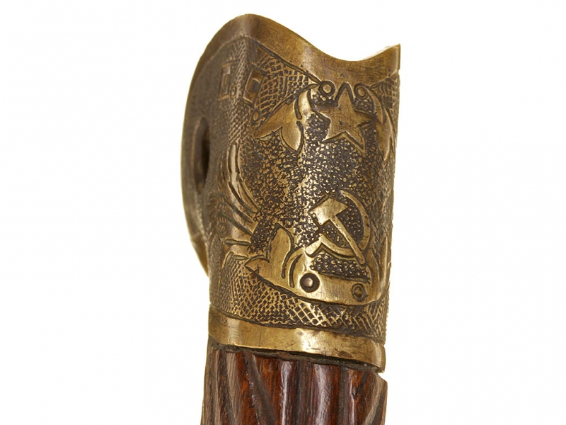 Шашка кавалерийская для красноармейцев и младших командиров выпуска 1940 года. Клинок практически неточенный, у основания клеймо Златоустовского инструментального комбината с годом. Рукоять деревянная, с латунными навершием и втулкой. Навершие украшено изображением серпа и молота с надписью "С.С.С.Р.". Ножны деревянные, грунтованные, с дополнительным креплением для штыка к винтовке Мосина. Штык в комплекте.