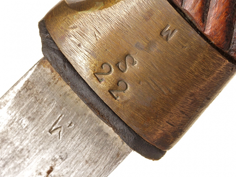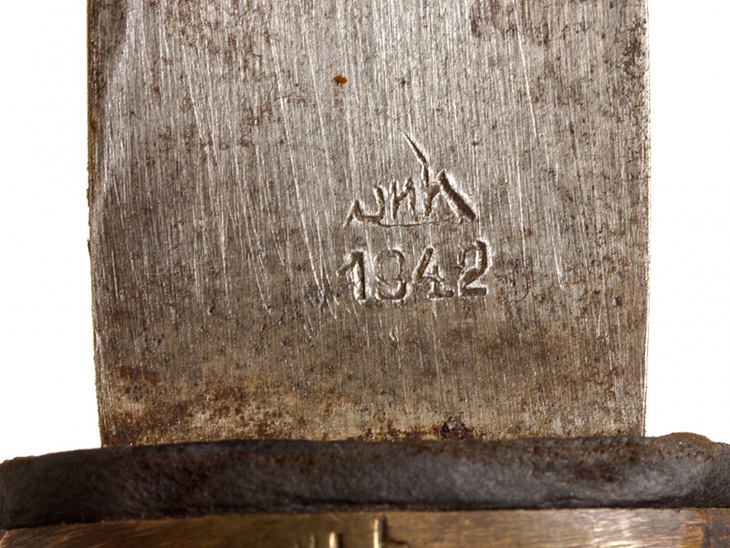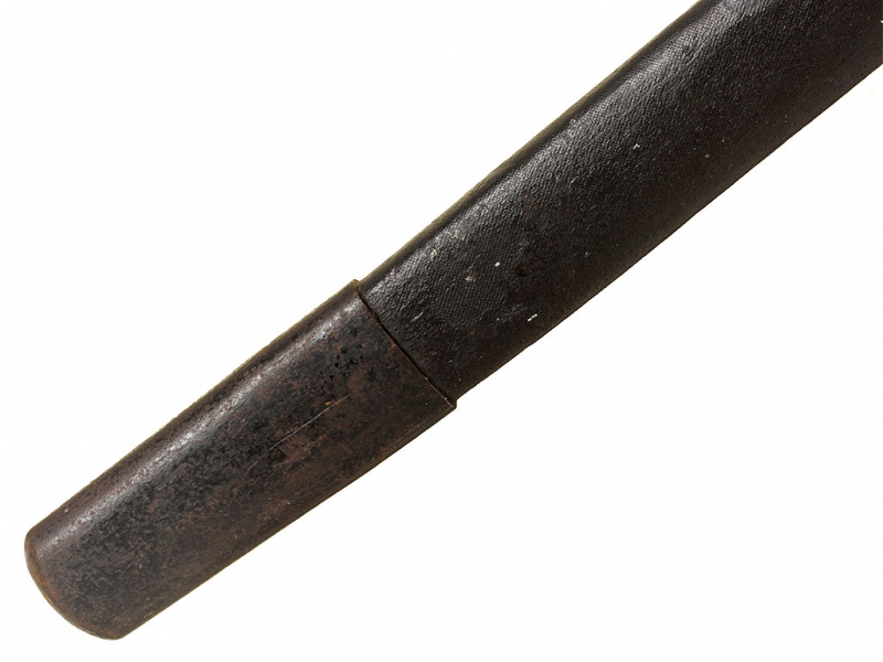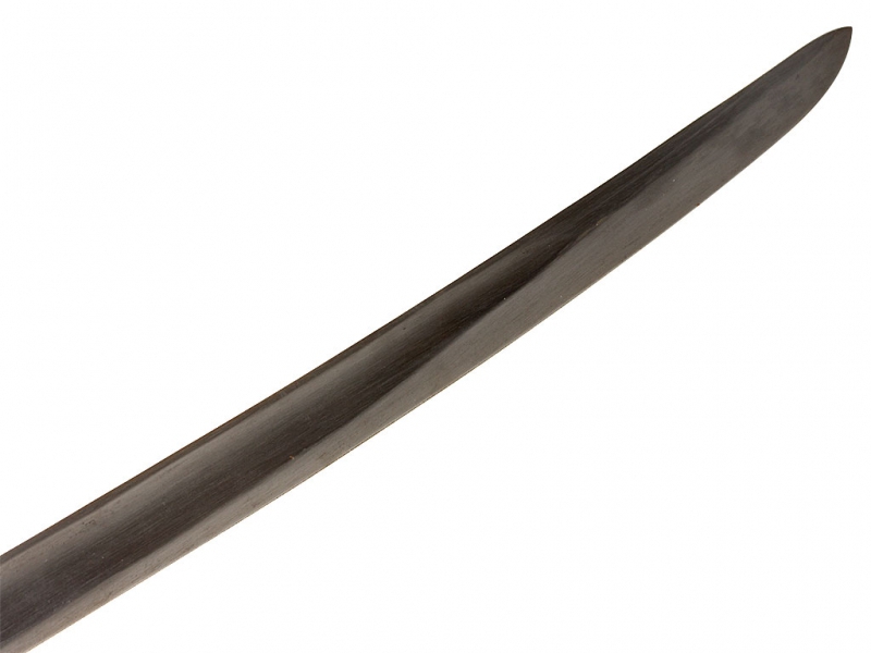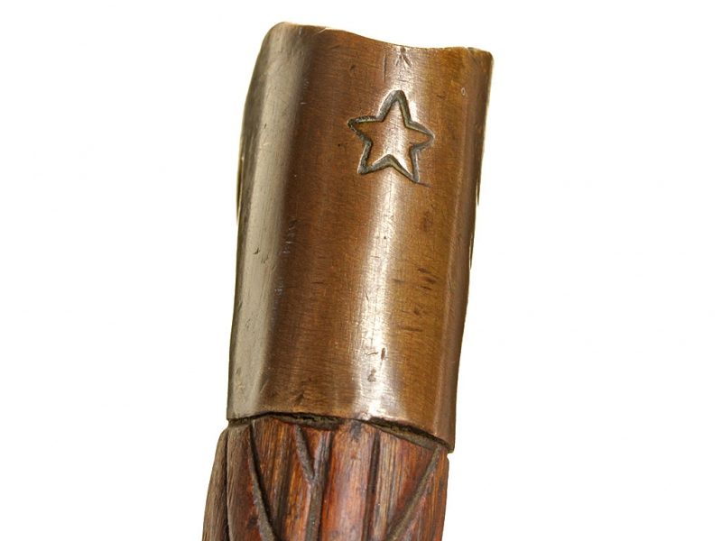 Шашка кавалерийская для красноармейцев и младших командиров выпуска 1942 года. Клинок с незначительными следами использования, у основания клеймо Златоустовского инструментального комбината с годом. Рукоять деревянная, с латунными навершием и втулкой. Навершие украшено изображением пятиконечной звезды. Ножны деревянные, грунтованные, оклеенные черным дерматином.