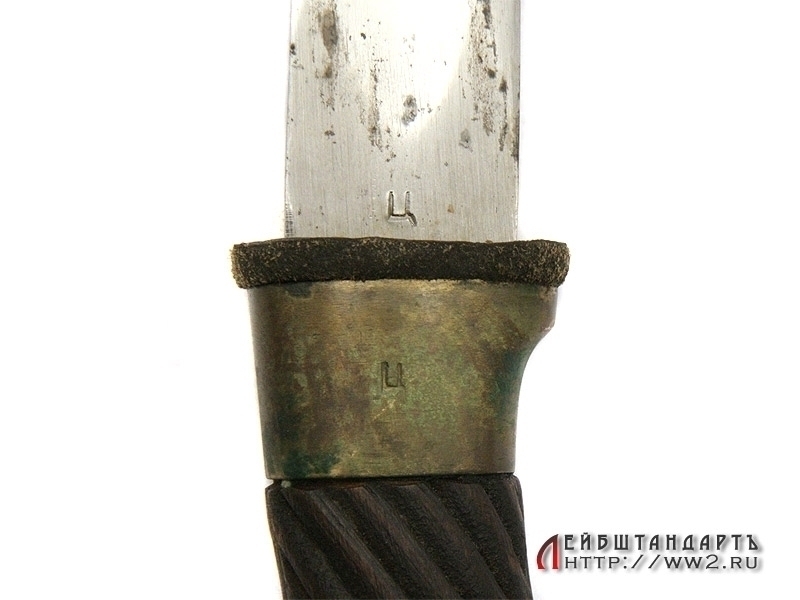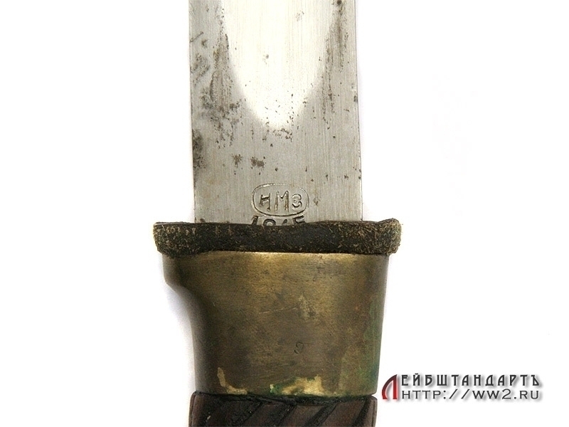 Шашка кавалерийская для командного и начальствующего состава РККА выпуска 1945 года в очень хорошей сохранности. Клинок с широкими долами, имеющий у основания заводское клеймо "ИМЗ" и год выпуска - 1945, а также приемочное клеймо "Ц". Рукоять деревянная, с латунными навершием и втулкой, на которой пробито аналогичное приемочное клеймо. Навершие украшено рельефным изображением серпа и молота с надписью "С.С.С.Р.". Ножны деревянные, грунтованные, в черном покрытии, у основания имеется незначительное повреждение.