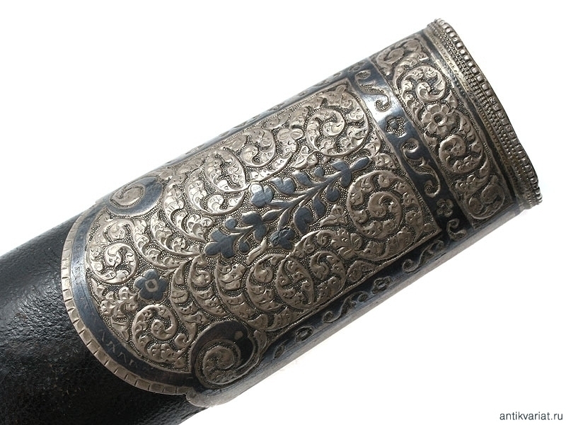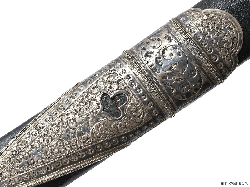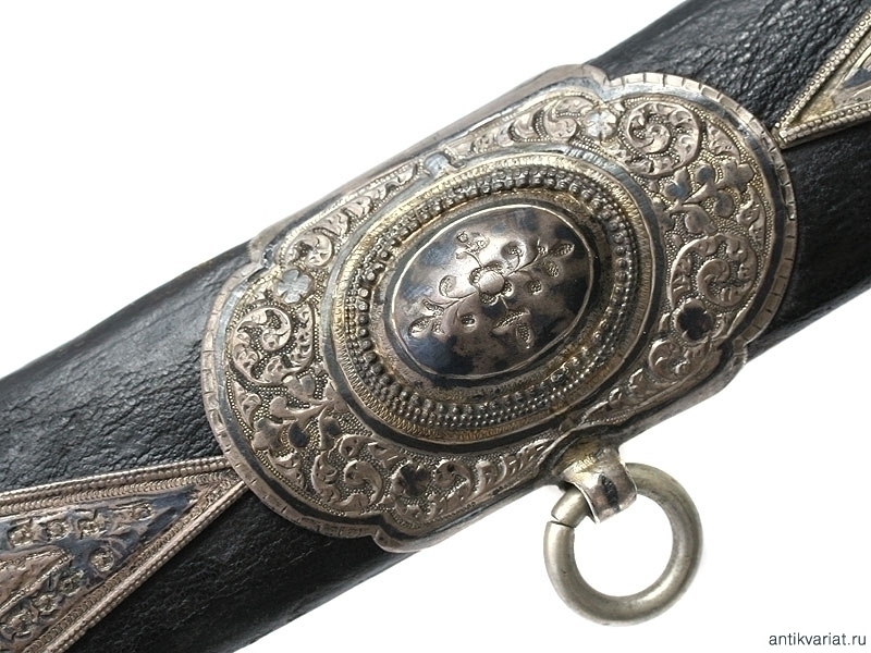 Ножны деревянные, обтянуты черной кожей. Прибор ножен состоит из серебряных устья, двух обоймиц, двух декоративных накладок сложной формы и наконечника, украшенных с лицевой стороны гравированным и черненым растительным орнаментом. Серебряный прибор практически повторяет "галунное" украшение ножен, бывшее в моде до середины XIX века.