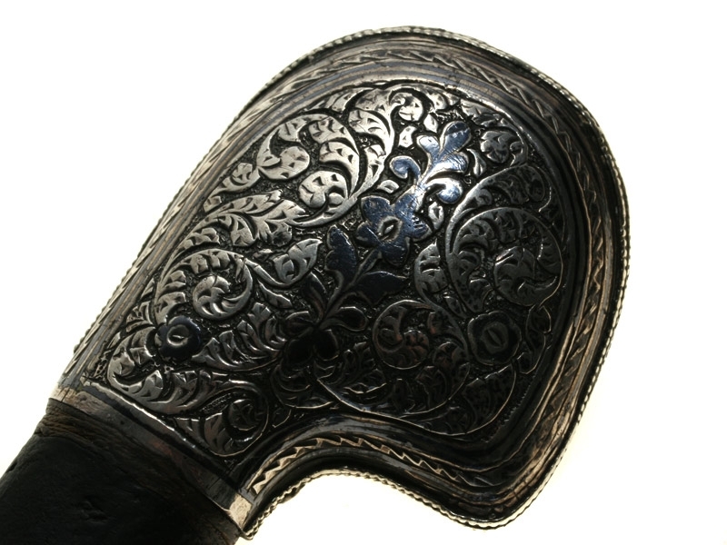 Рукоять шашки роговая, оклеена верблюжьей кожей. Навершие обложено серебром, украшенным гравировкой и чернью. В орнаменте преобладают сложные растительные завитки. Орнамент кубачинский (возможно, лаккский).