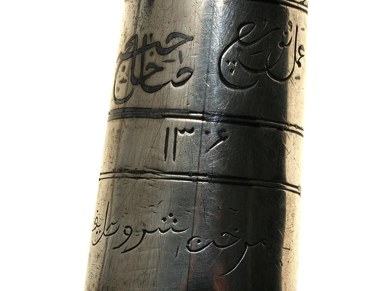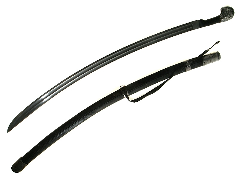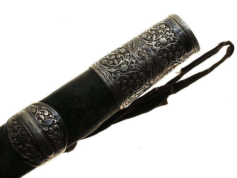 Ножны деревянные, обтянуты черной верблюжьей кожей. Прибор ножен состоит из серебряных устья, двух обоймиц и наконечника, украшенных с лицевой стороны гравированным растительным орнаментом. На оборотной стороне устья ножен имеются гравированные арабографичные надписи: "Работа Нуши", "Хозяин Хасан 1886/87 год", "Во славу халифа Мурхан Шува".