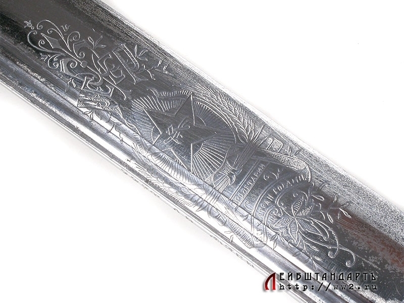 На клинке присутствует очень красивая оригинальная гравировка с надписью "РСФСР" и сокращенным девизом "Пролетарии всех стран, соедин(яйтесь!), а также изображение пятиконечной звезды с плугом и молотом.