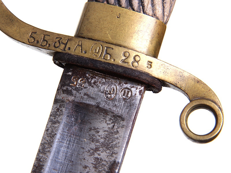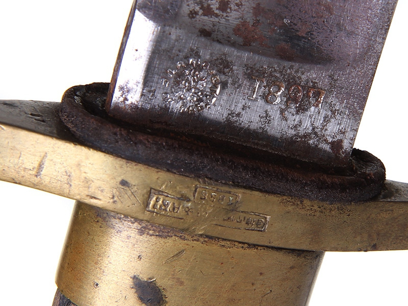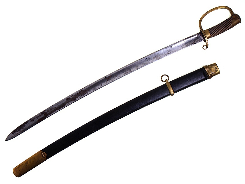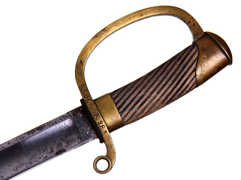 Шашка нижних чинов драгунского типа образца 1881 года. Клинок с клеймом Златоустовской оружейной фабрики у основания, датирован 1897 годом, имеются клейма военной приемки. Рукоять деревянная, с наклонными продольными желобками. Прибор гарды бронзовый, также с клеймом Златоустовской оружейной фабрики и годом выпуска - 1896. На гарде имеется полковое клеймо: "5.Б.34.А.Б.28" (5-я батарея 34-й артиллерийской бригады). Ножны деревянные, обтянутые черной кожей, с бронзовым прибором.