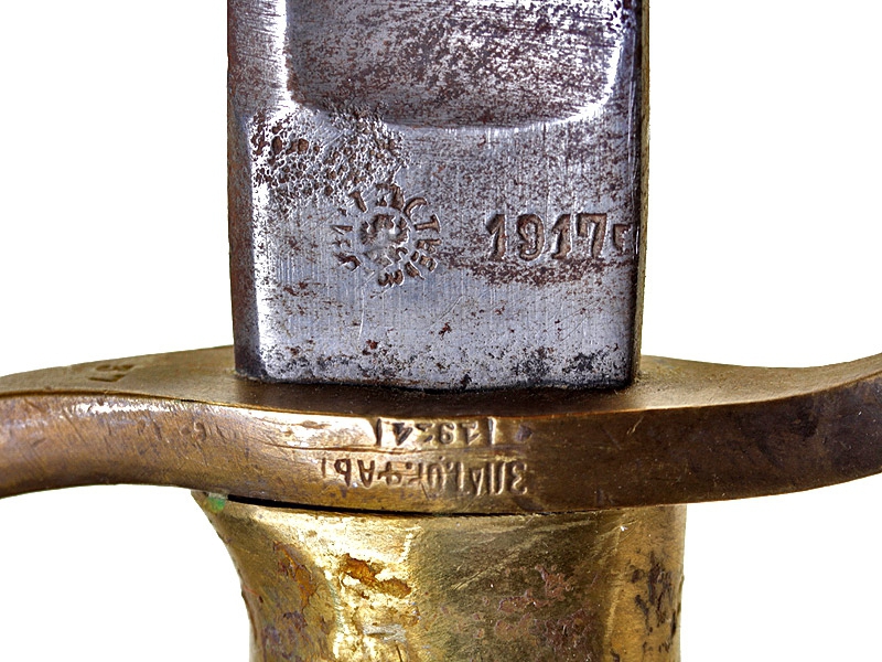 Шашка нижних чинов драгунского типа образца 1881 года. Клинок с клеймом Златоустовской оружейной фабрики и годом выпуска (1917) у основания, на оборотной стороне - клейма военной приемки. Рукоять деревянная, с продольными наклонными желобками. Прибор рукояти бронзовый, с клеймами Златоустовской оружейной фабрики и клеймами военной приемки на дужке гарды. Ножны отсутствуют.
