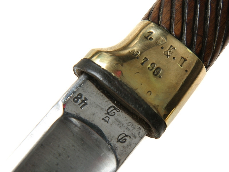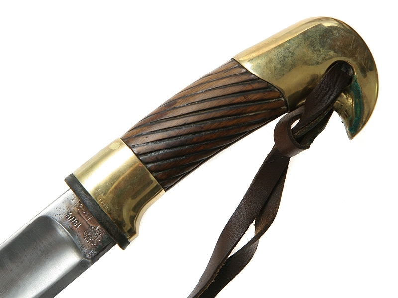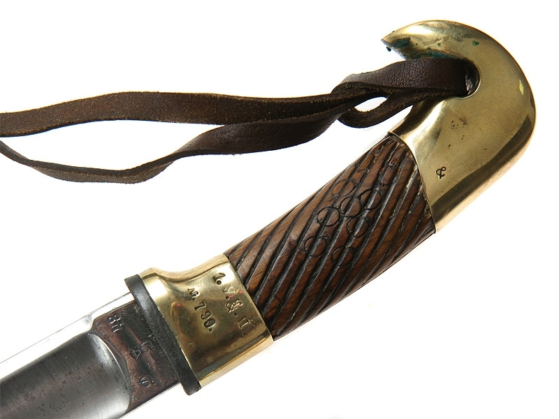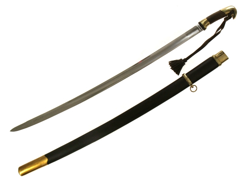 Ножны деревянные грунтованные, с латунным прибором. Покрытие на ножнах отреставрировано, клинок и прибор отполированы.