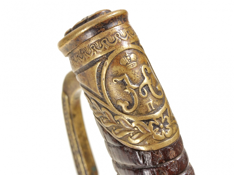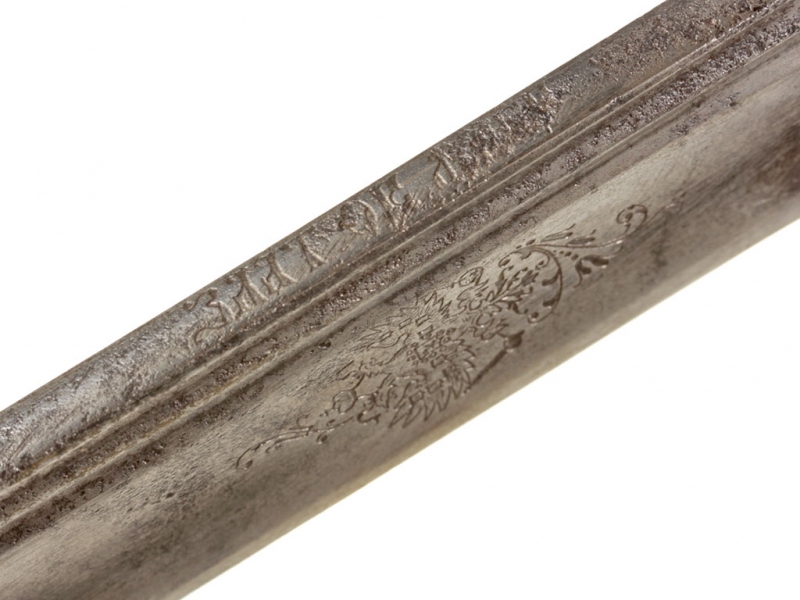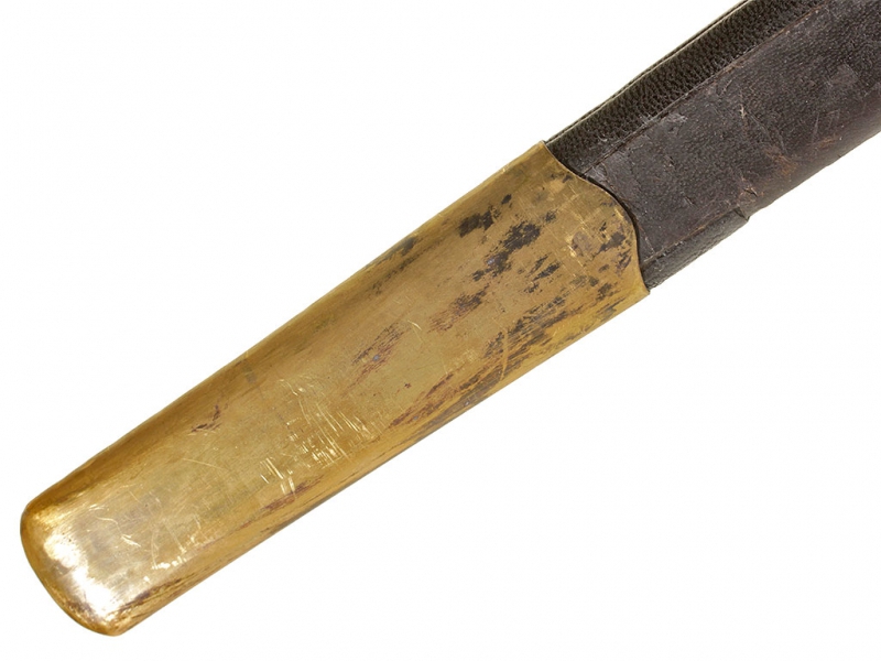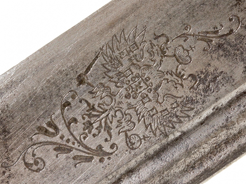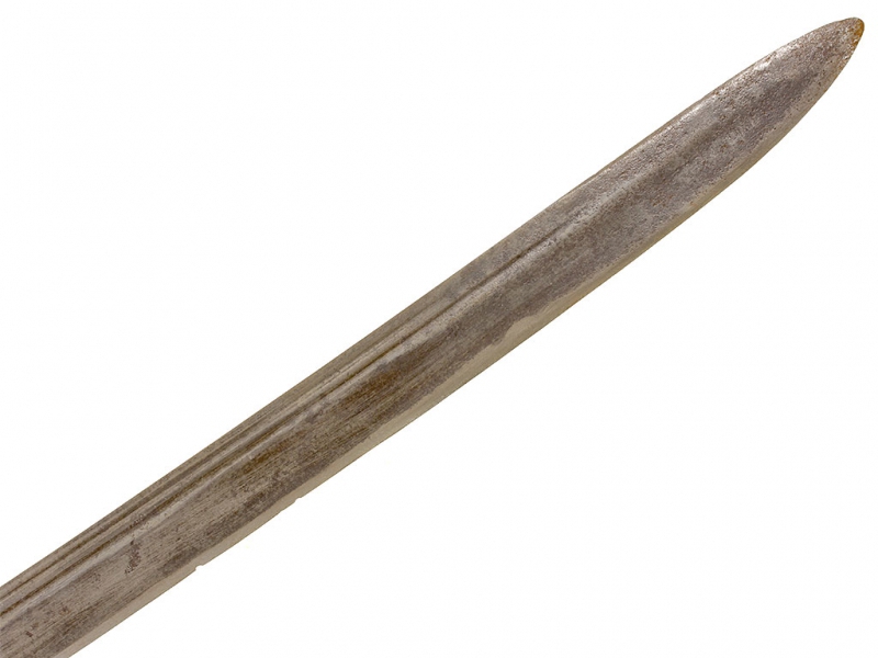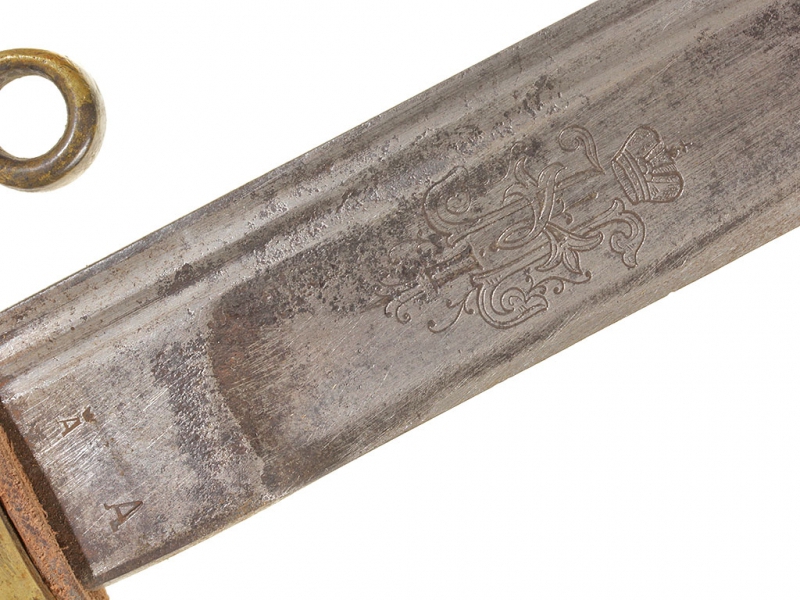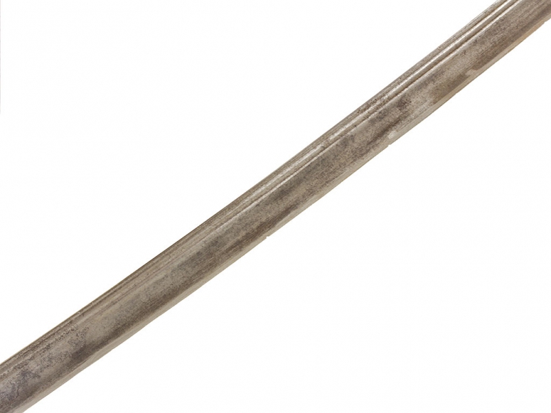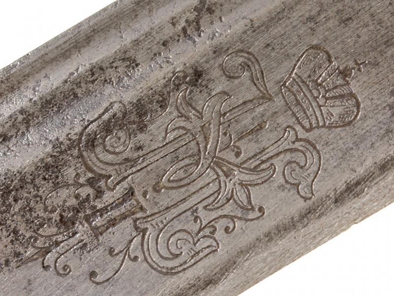 Офицерская шашка драгунского типа образца 1909 года. Клинок с одним широким и двумя узкими долами, с лицевой стороны украшен изображением двуглавого орла, с оборотной помещен вензель Императора Николая II. На обухе клинка - надпись "Злат. Ор. Фабр." (Златоустовская оружейная фабрика). У основания клинка имеются приемочные клейма. Черен рукояти деревянный, с поперечными желобками. Прибор рукояти бронзовый, золочение сохранилось лишь в недоступных для чистки местах. На верхней втулке рукояти - вензель Императора Николая II (в правление которого владелец шашки был произведен в офицеры). Гарда чуть подогнута владельцем по моде того времени.