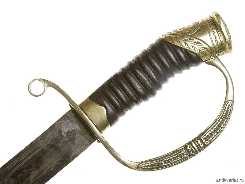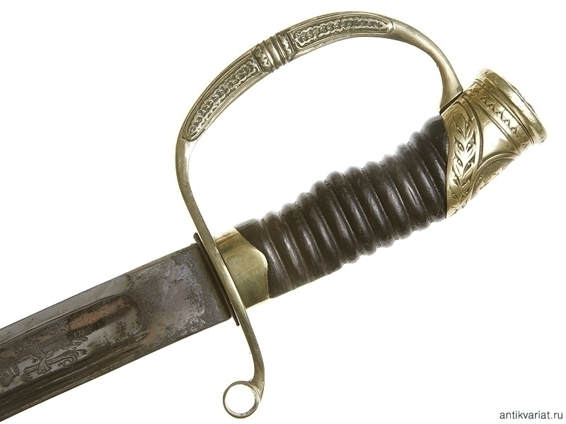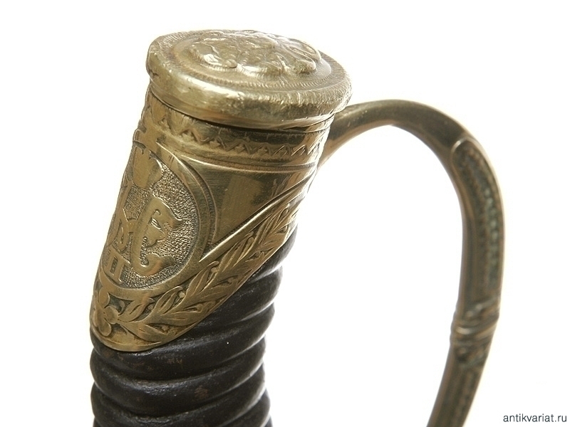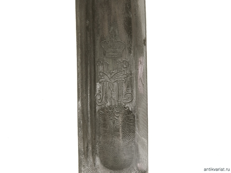 Рукоять эбонитовая. Гарда и навершие латунные, фигурная втулка украшена вензелем Николая Второго, в царствование которого владелец получил первый офицерский чин.