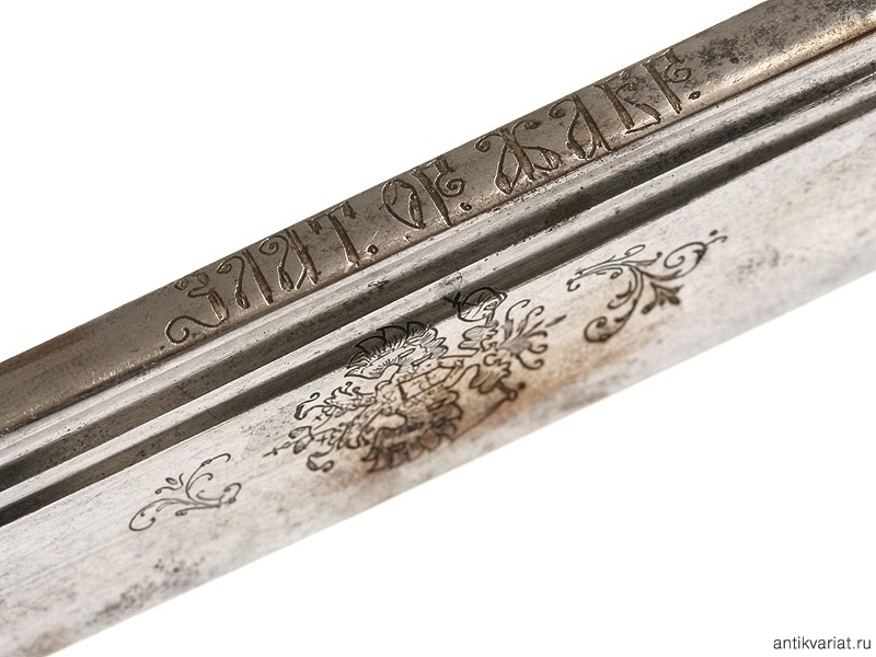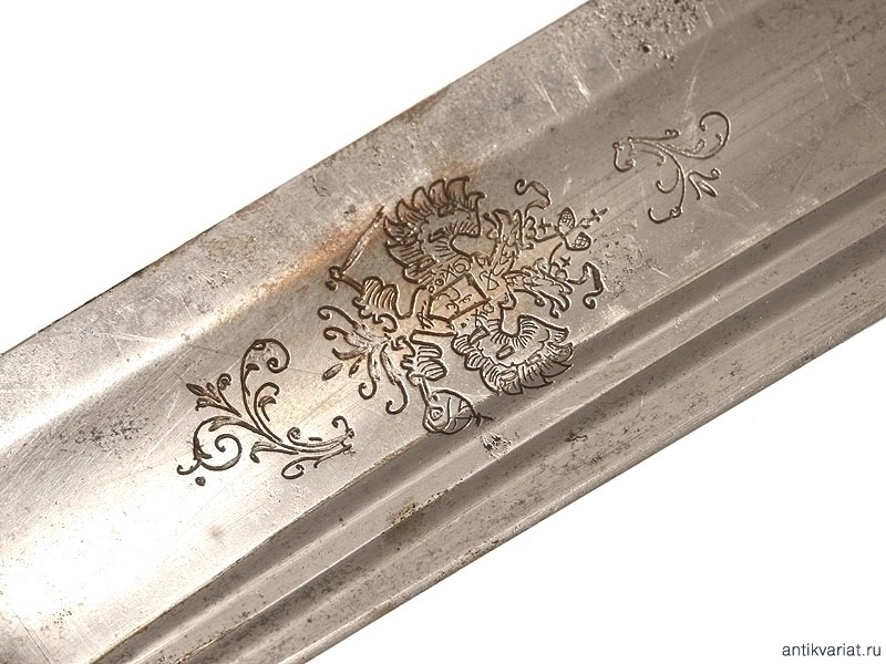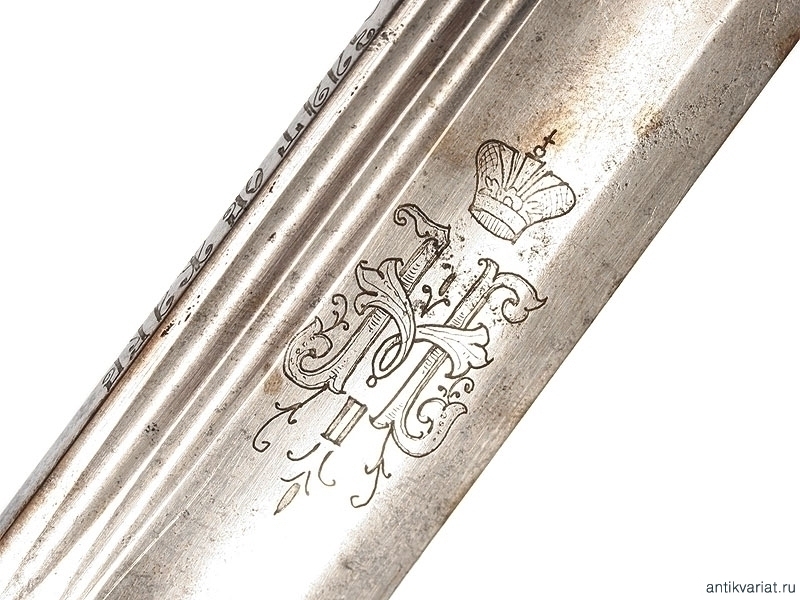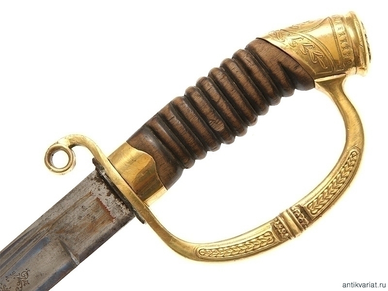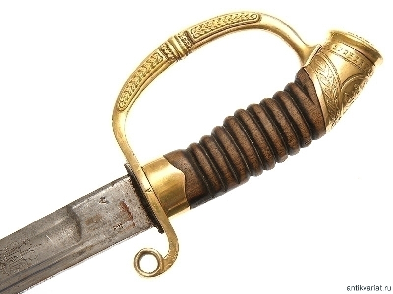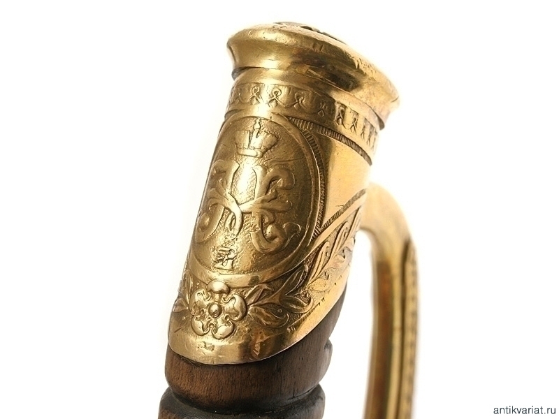 Шашка офицерская драгунского типа образца 1909 года. Клинок украшен гравированными изображениями Государственного герба и вензелем Николая II. На обухе клинка - надпись "Златоустовская оружейная фабрика". Рукоять деревянная. Гарда и навершие латунные, фигурная втулка украшена вензелем Николая Второго, в царствование которого владелец получил первый офицерский чин. Частично сохранилось оригинальное золочение. Ножны отреставрированы.