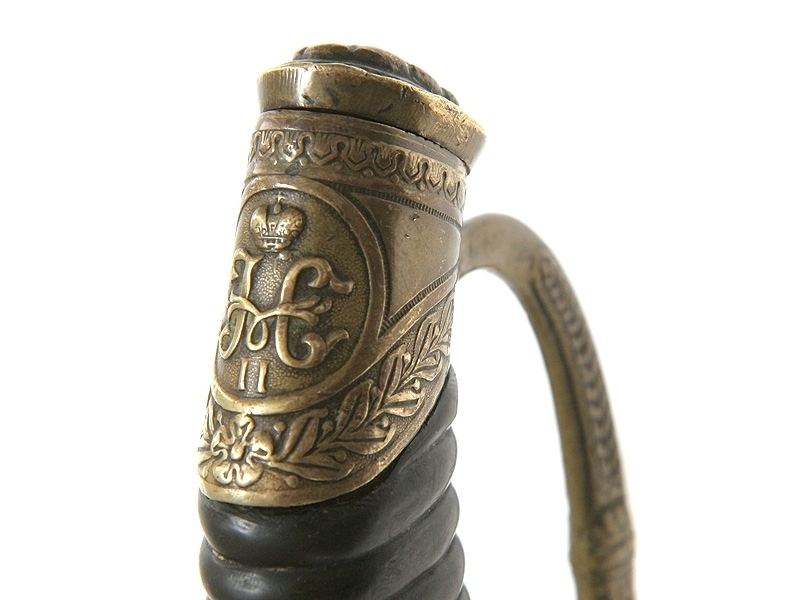 Шашка офицерская драгунского типа образца 1909 года. Клинок с клеймом фабрики бр.Завьяловых, в оригинальной никелировке. Рукоять эбонитовая, без сколов. Гарда и навершие латунные, фигурная втулка украшена вензелем Николая Второго, в царствование которого владелец был произведен в офицеры. Ножны деревянные, обтянутые кожей. Очень хорошее состояние.
