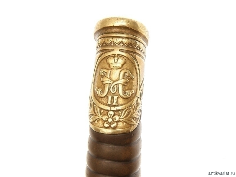 Шашка офицерская драгунского типа образца 1909 года. Клинок никелированный, маркирован клеймом "Златоуст ". Красивое травление по клинку в виде растительного орнамента и государственного герба. Рукоять бакелитовая. Гарда и навершие латунные с остатками позолоты, все элементы с очень качественной проработкой элементов, фигурная втулка украшена вензелем Николая Второго, в царствование которого владелец получил первый офицерский чин. Идеальное состояние.