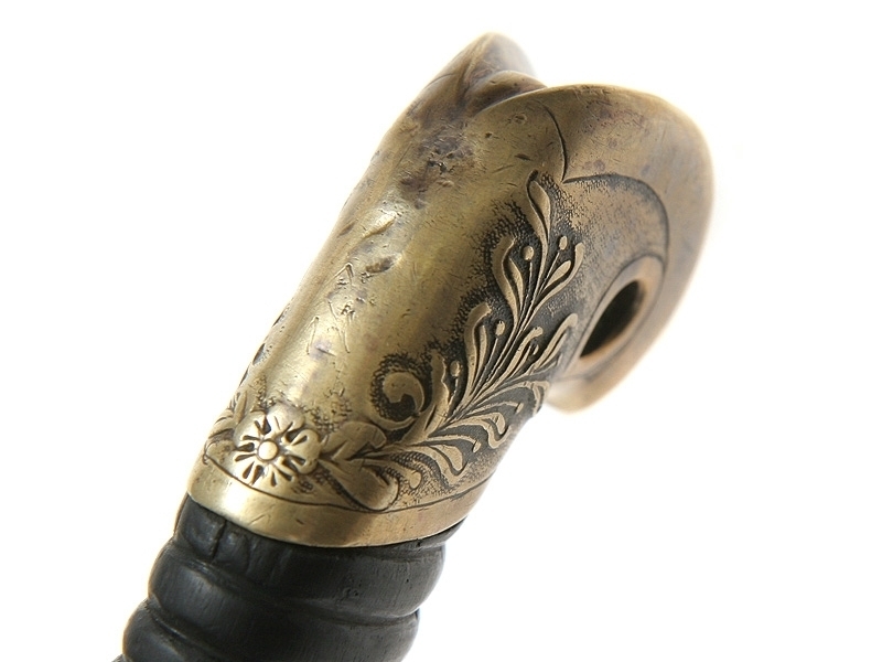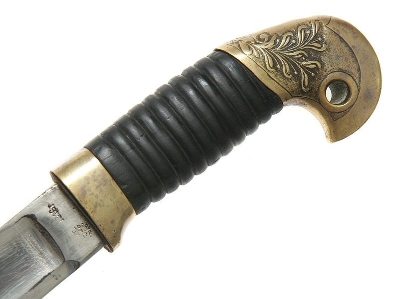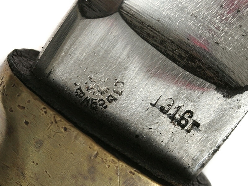 Рукоять деревянная, с поперечными желобками. Втулка и головка рукояти латунные, на головке в венке отсутствует вензель Николая Второго - убран владельцем по приказу после Февральской революции.