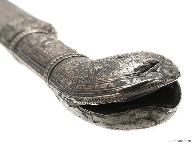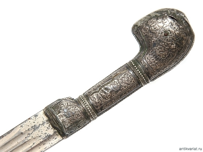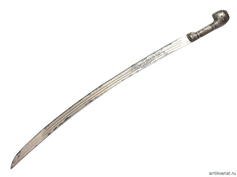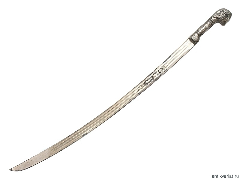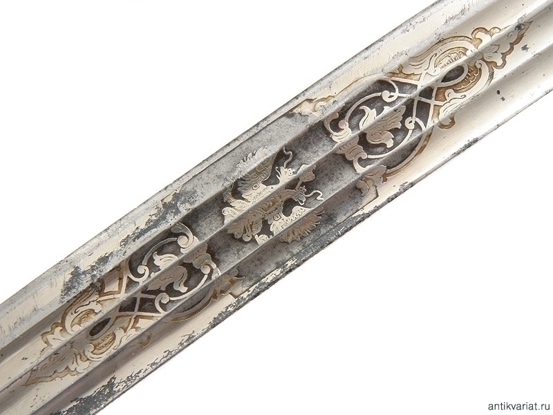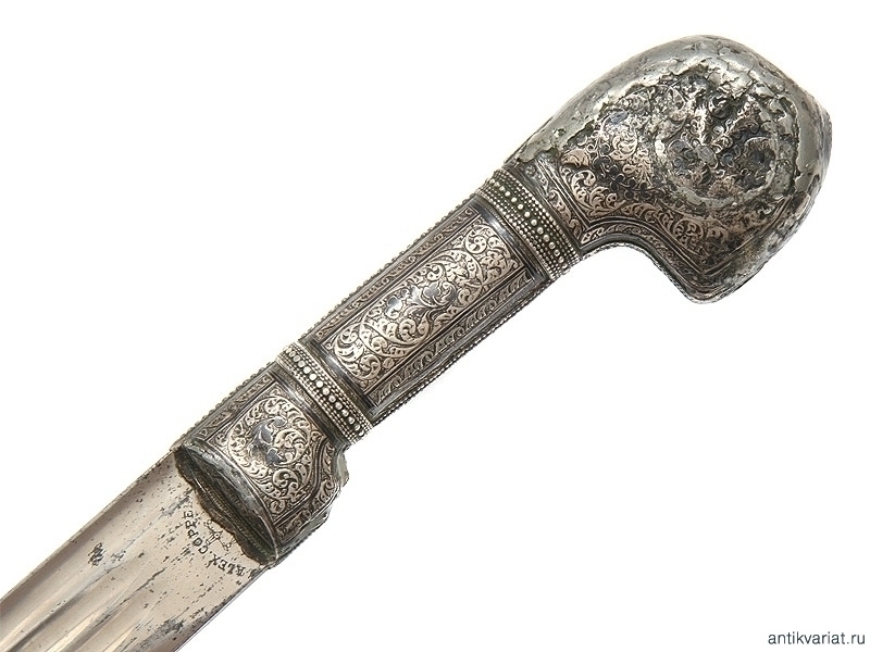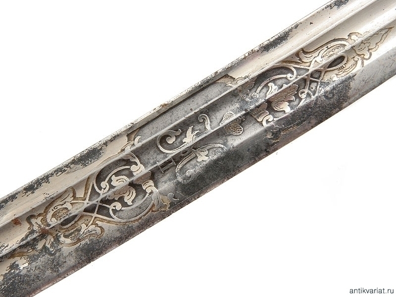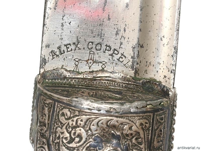 Шашка офицерская казачья кавказского типа с заказным клинком, изготовленным фирмой Алекса Коппеля в Золингене. Клинок никелированный, с обеих сторон украшен травлением: с лицевой стороны помещено изображение двуглавого орла, с оборотной - вензель Императора Николая II. Рукоять серебряная, украшена гравированным растительным орнаментом и чернью. Ножны отсутствуют.