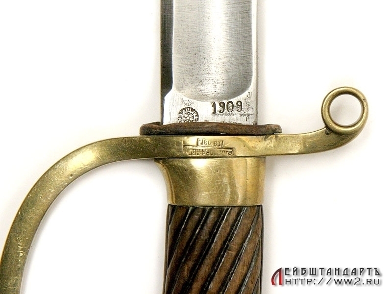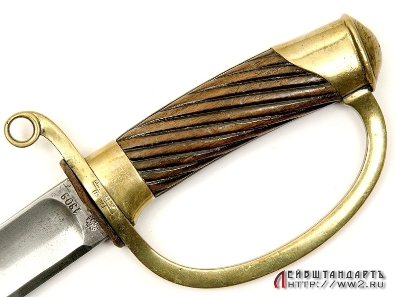Шашка солдатская драгунского типа обр. 1881 года в очень хорошем состоянии. Клинок с одним широким долом, у основания находится клеймо Златоустовской оружейной фабрики, год изготовления - 1909 и клейма военной приемки. Клинок в значительной степени сохранил оригинальную заводскую заточку. Рукоять деревянная, с наклонными продольными желобками. Прибор гарды бронзовый, на дужке имеется клеймо Златоустовской оружейной фабрики с годом, на оборотной стороне указан шифр подразделения, в котором служил владелец предмета. Ножны деревянные, обтянутые черной кожей. Прибор ножен бронзовый, также в очень хорошей сохранности.