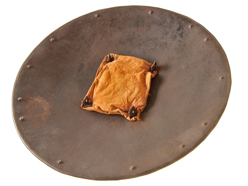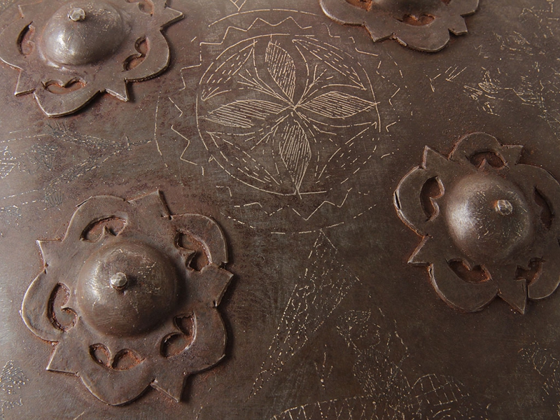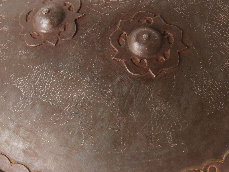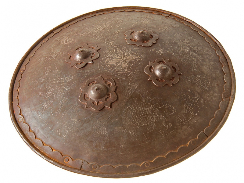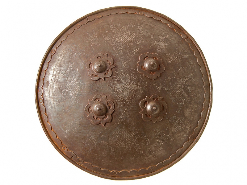 Щит, изготовленный в первой половине XX века. Стальная поверхность щита украшена таушированными серебром фигурками марширующих воинов и боевых слонов. У центра помещены четыре сферические заклепки, также имеющие серебряную насечку. С внутренней стороны щит имеет четыре кольца для крепления ремней и подушечку для руки.