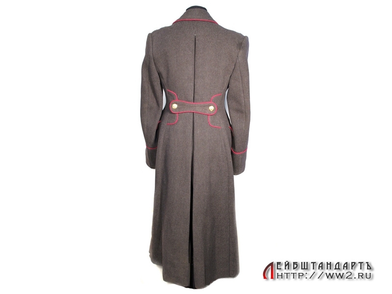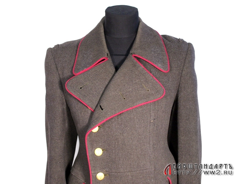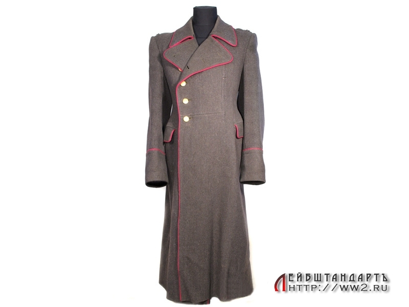 Шинель повседневная генерала технических войск образца 1955 года в очень хорошем состоянии. По отворотам, рукавам и хлястику проходит вшитый малиновый кант. На плечах присутствуют лямки под пристяжные погоны.