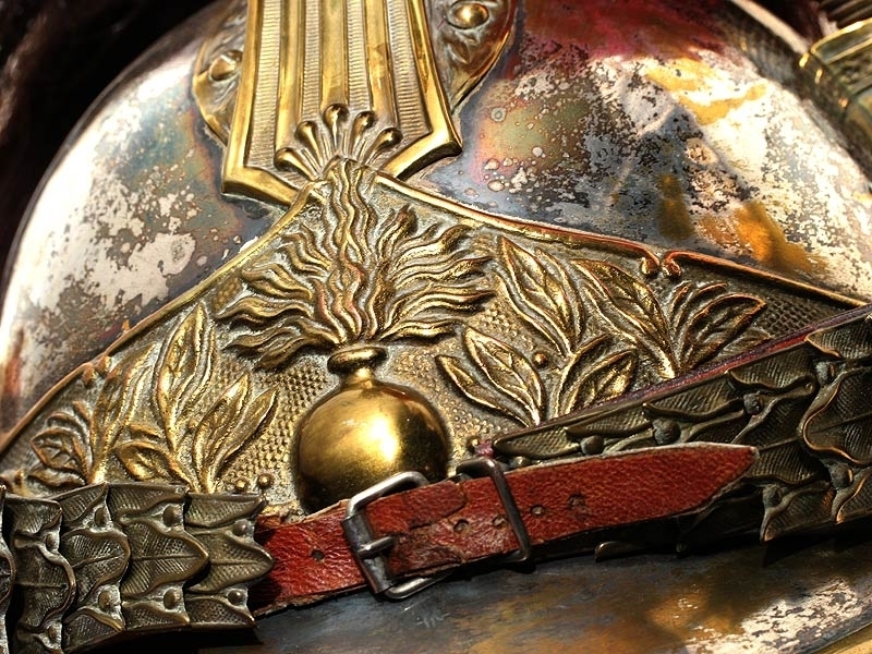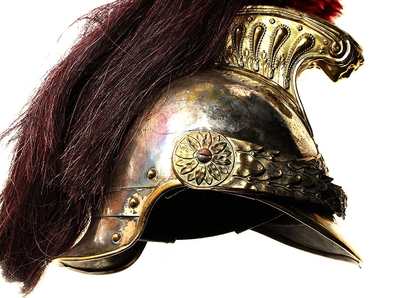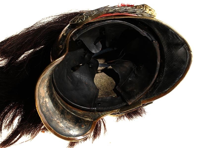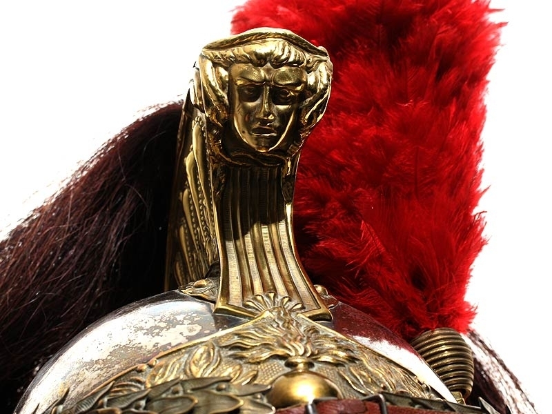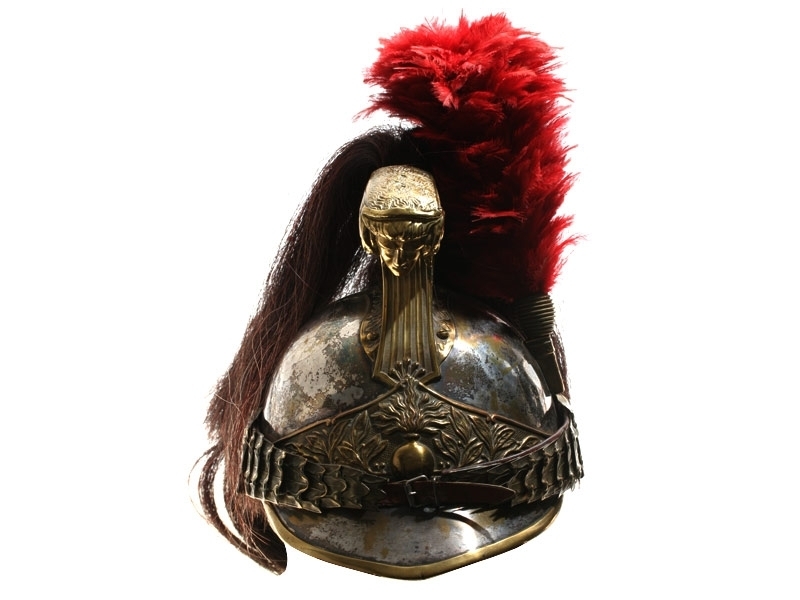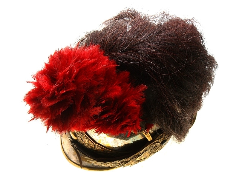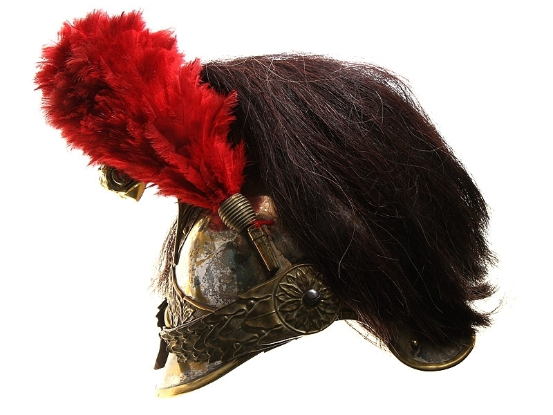 Шлем кирасирский периода Первой мировой войны. Сфера из посеребренной латуни, с гребнем, украшенный античным аллегорическим изображением. Сохранился оригинальный султан из коричневого конского волоса и перьев. На подшлемнике имеется клеймо изготовителя "Hans Weber Neu-Ulm" сдатой изготовления: 1916 год. Очень хорошее состояние, красивый интерьерный предмет.
