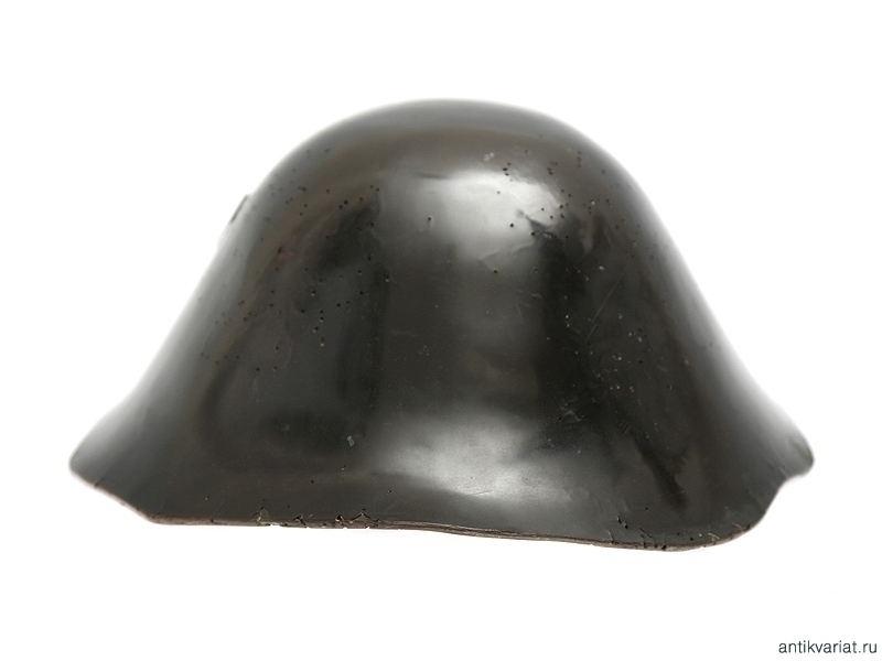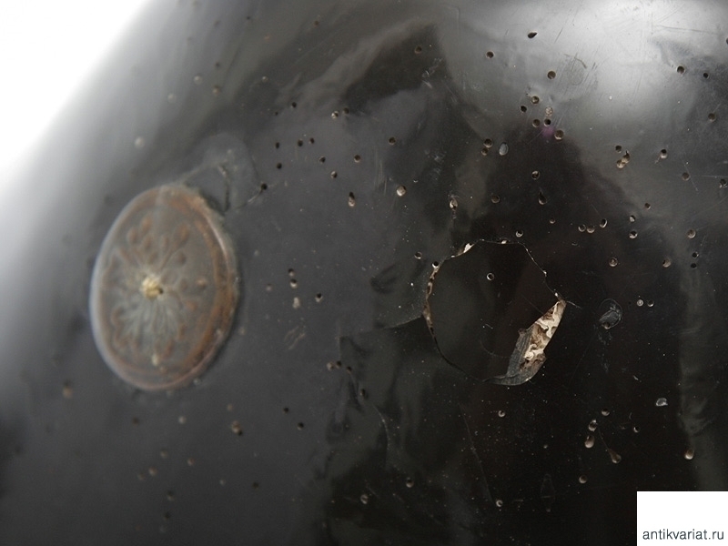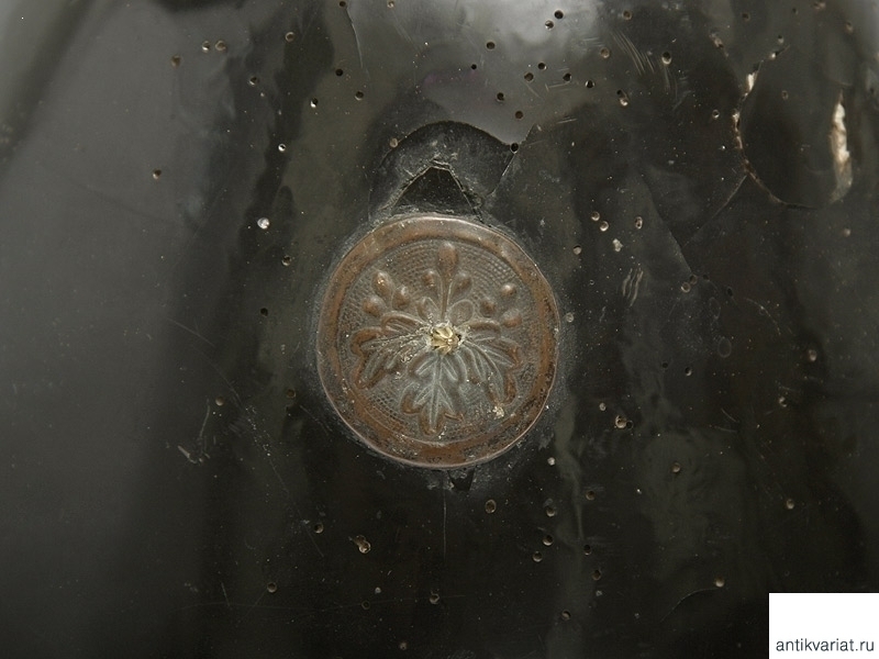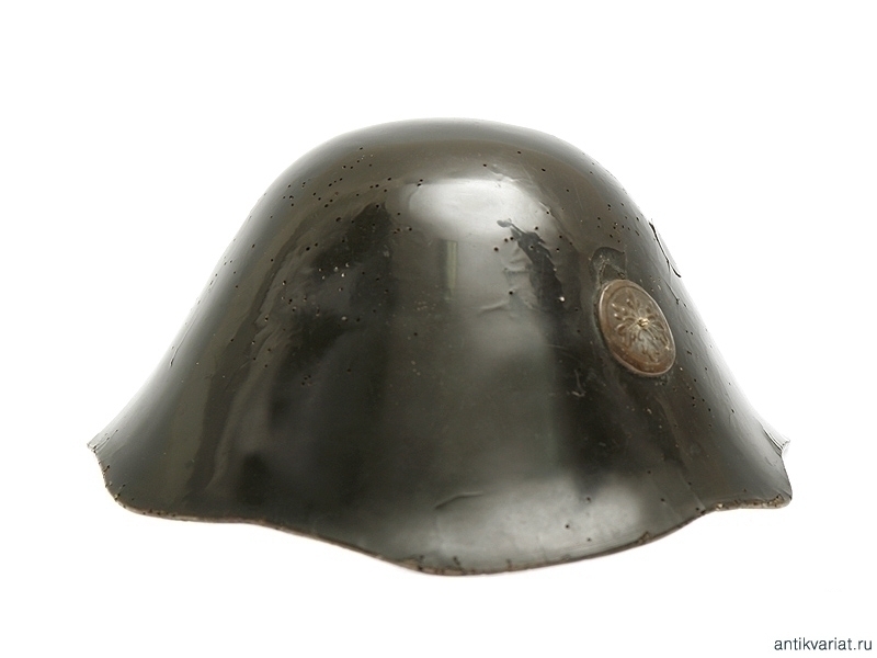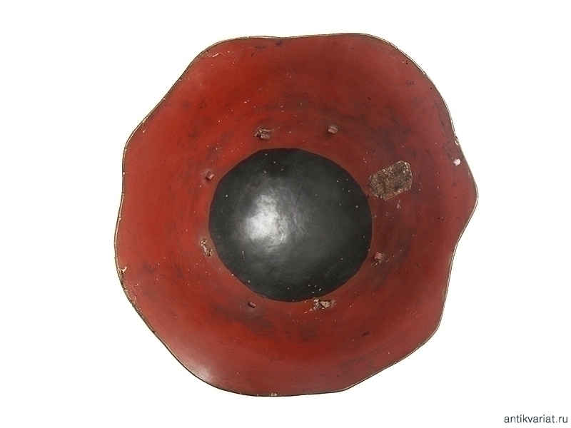 Японский традиционный шлем "кобуто". Папье-маше, черный многослойный лак. Имеется металлическая накладка с императорским гербом павлонии. На внутренней стороне - бумажная наклейка с именем владельца. Первая половина XIX века. Очень хорошее состояние, имеются повреждения основы от жука-древоточца.