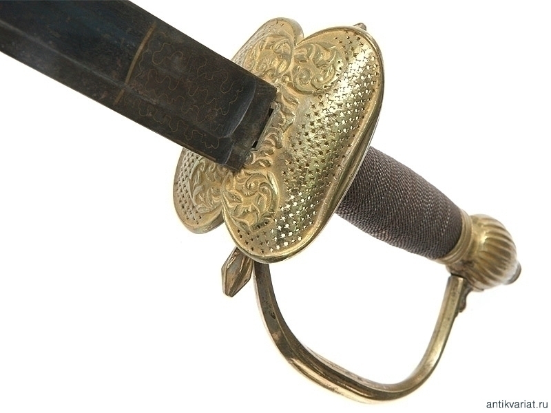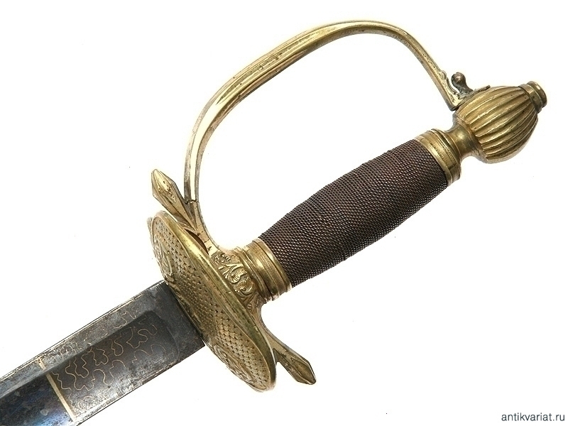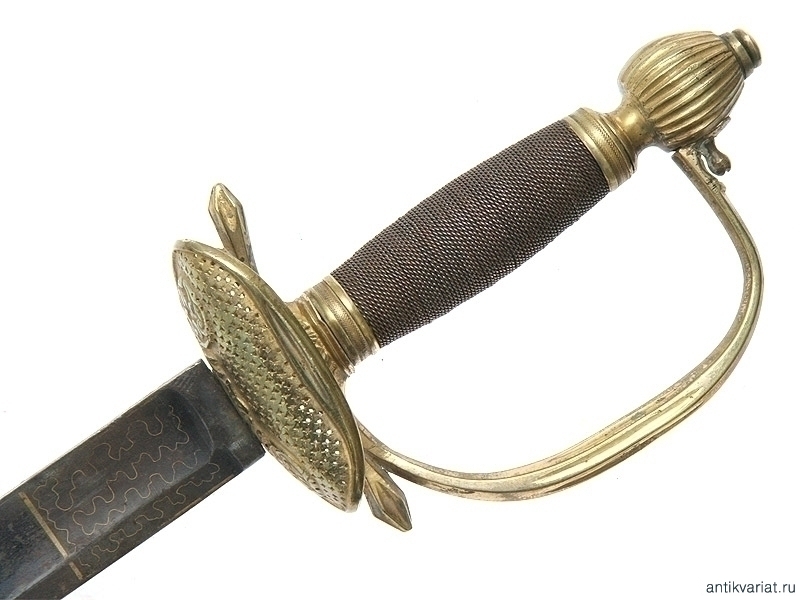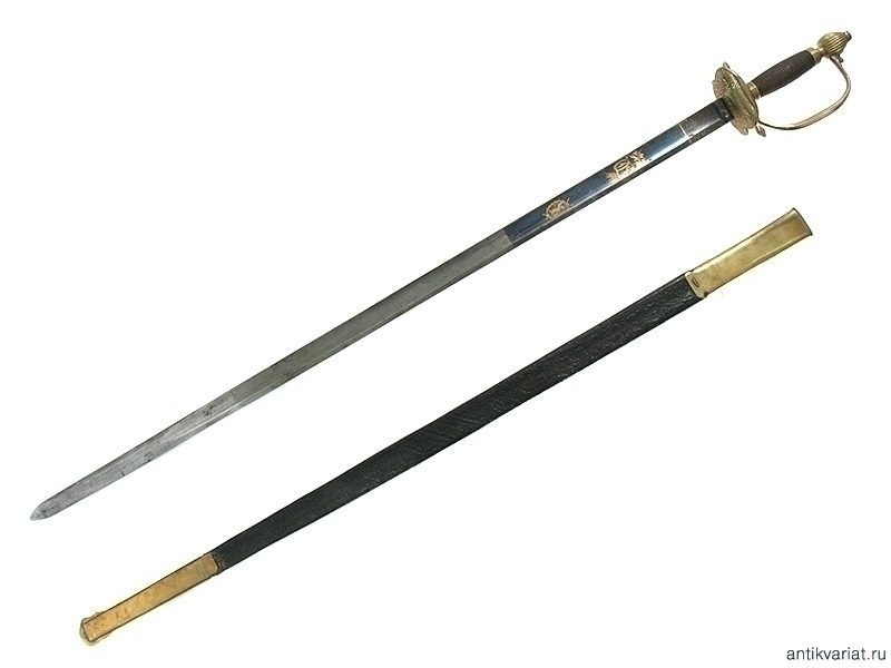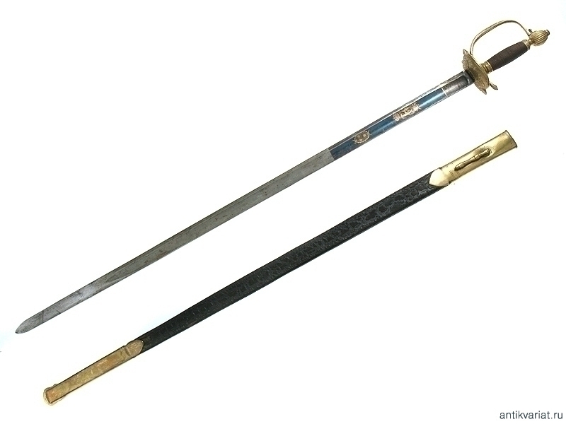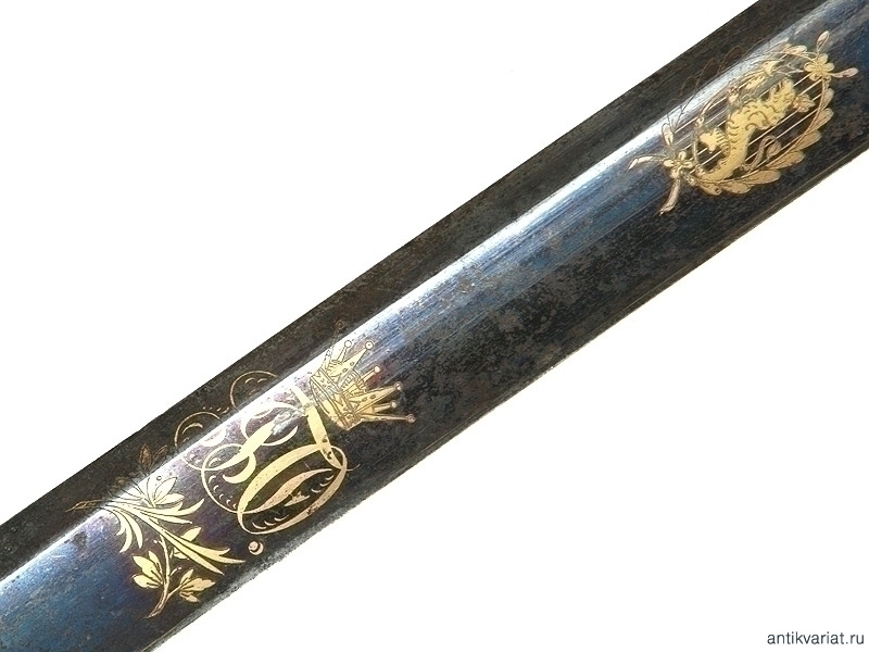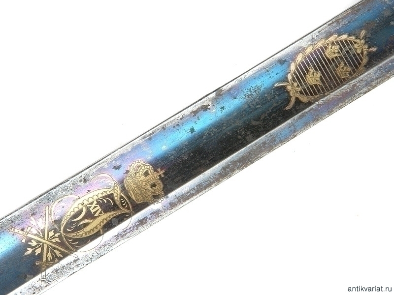 Шпага армейская в очень хорошей сохранности. Клинок украшен канфарением и золочением, на нем нанесены вензеля короля и владельца, а также государственный и дворянский гербы. Рукоять деревянная, обтянутая витой посеребренной проволокой. Металлический прибор изготовлен из позолоченной бронзы. Ножны кожаные, с латунным вызолоченным прибором.