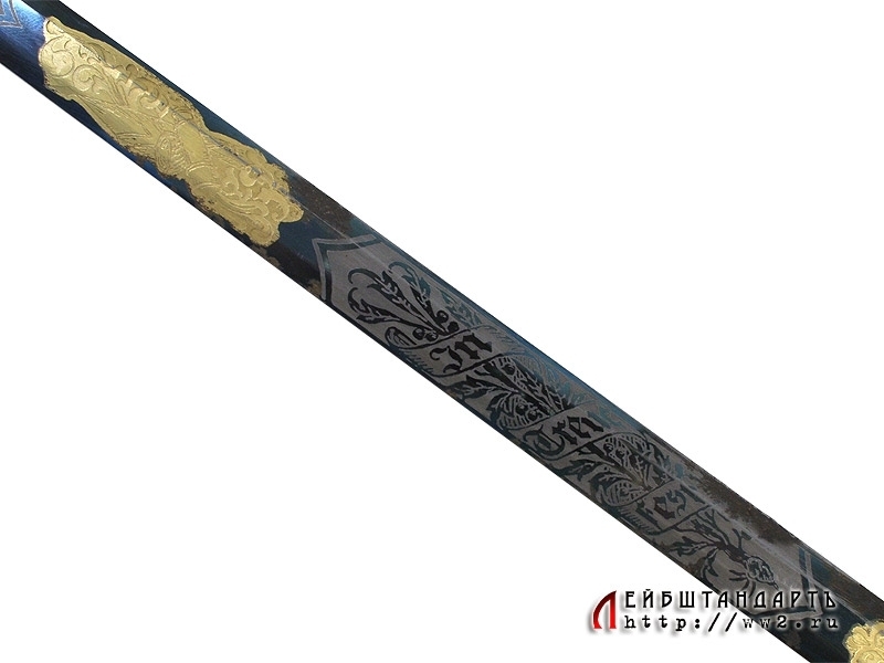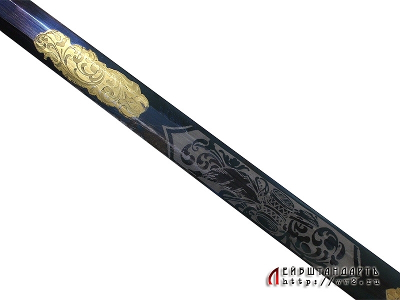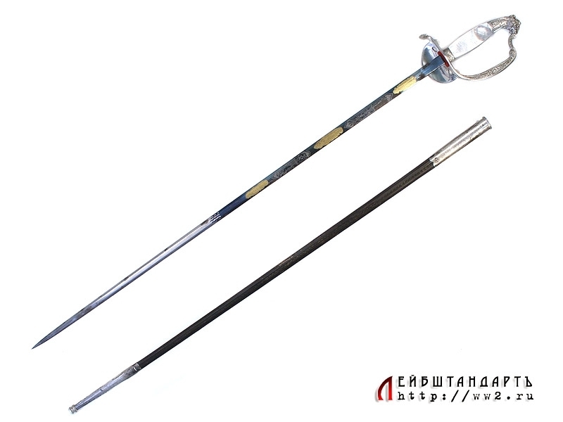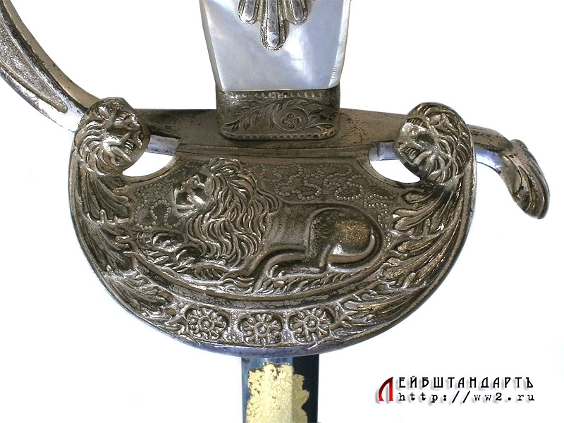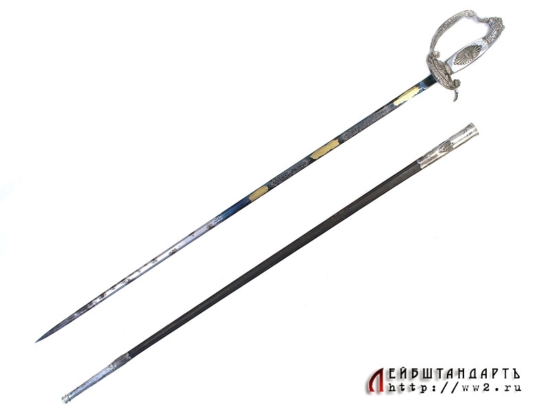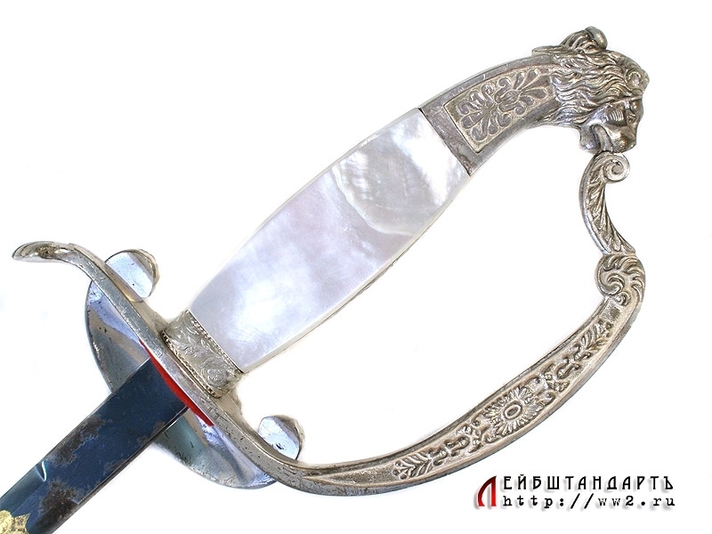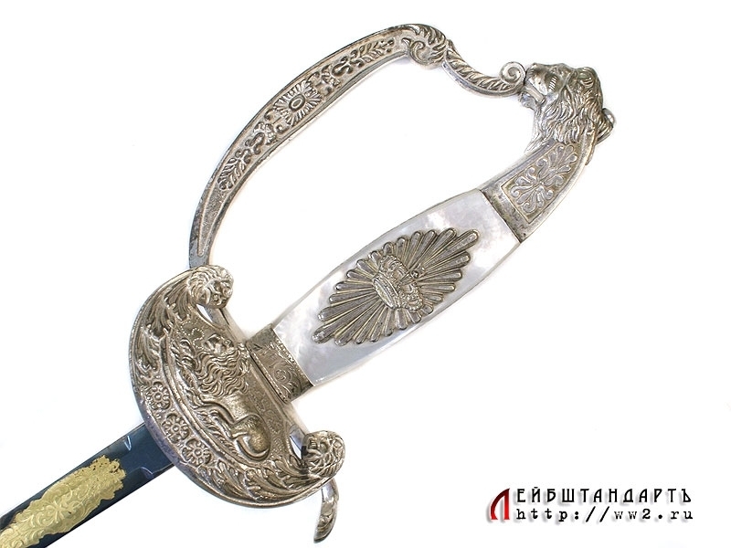 Шпага баварского чиновника конца XIX - начала XX века в заказном исполнении и очень хорошей сохранности. Общая длина предмета - 93,5 см, длина без ножен - 91,5 см, длина клинка - 78,4 см. Клинок на две трети украшен травленым орнаментом с изображением военной атрибутики, покрытым канфарением и золочением. Там же размещен и национальный баварский девиз: "В чести сила!". Эфес в оригинальном серебрении, на чашке рельефное изображение лежащего баварского льва. Рукоять образована двумя перламутровыми щечками. Ножны кожаные черные, с посеребренными устьем и наконечником.