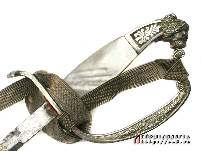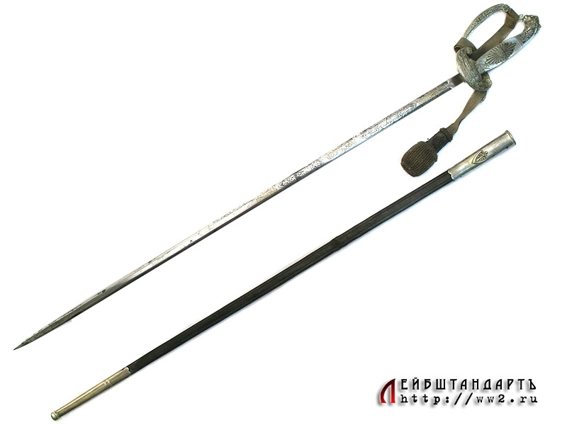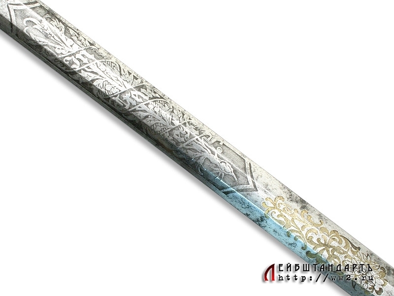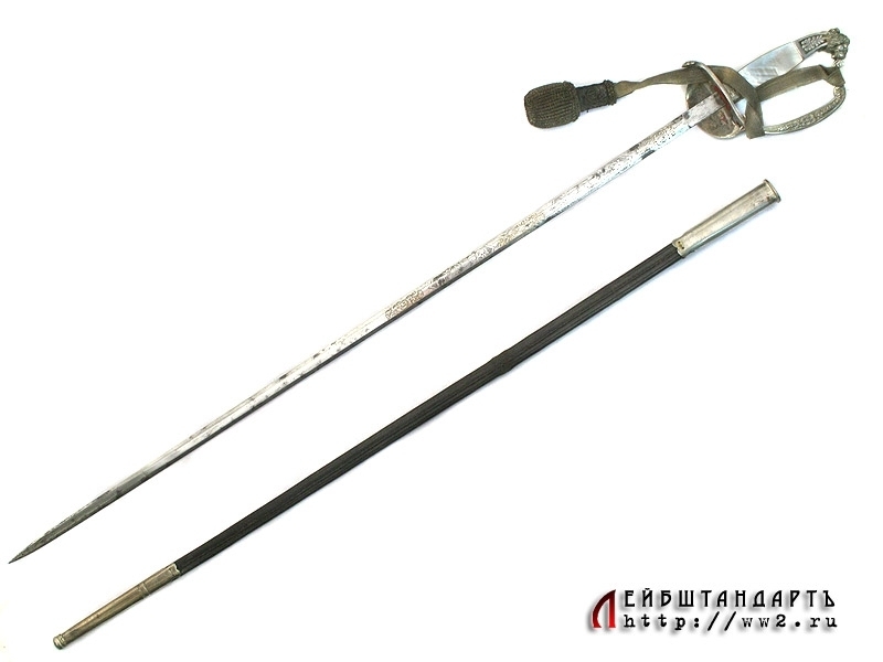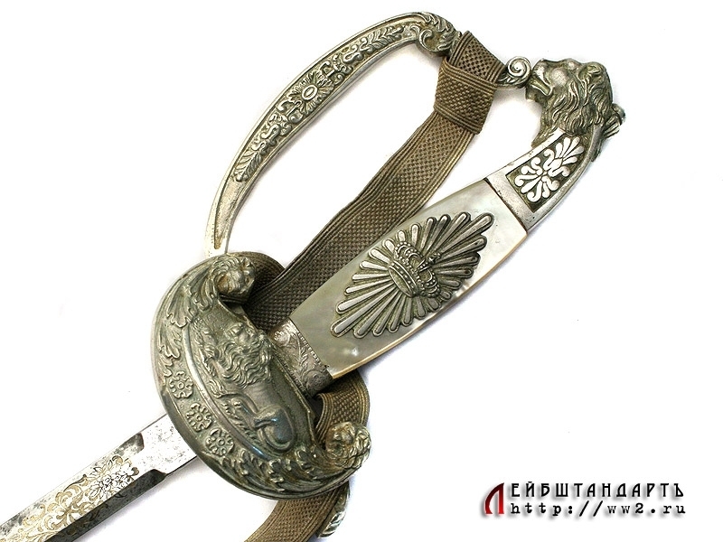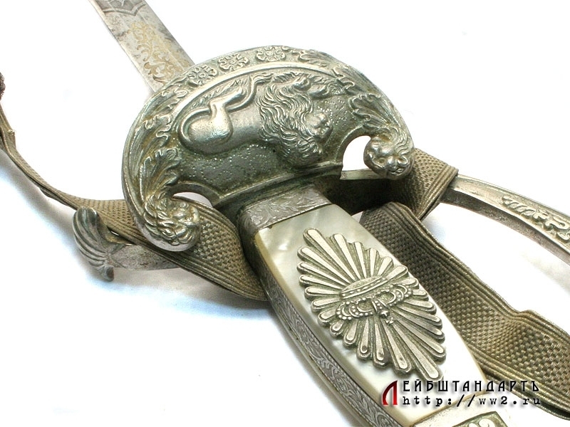 Шпага баварского чиновника конца XIX - начала XX века в заказном исполнении и очень хорошей сохранности. Клинок на две трети украшен травленым орнаментом с изображением военной атрибутики и орнаментальными розетками, покрытыми канфарением и золочением. Там же размещен и национальный баварский девиз: "В чести сила!". Эфес в оригинальном серебрении, на чашке рельефное изображение лежащего баварского льва. Рукоять образована двумя перламутровыми щечками. Ножны кожаные черные, с посеребренными устьем и наконечником. Превосходно сохранился оригинальный темляк.