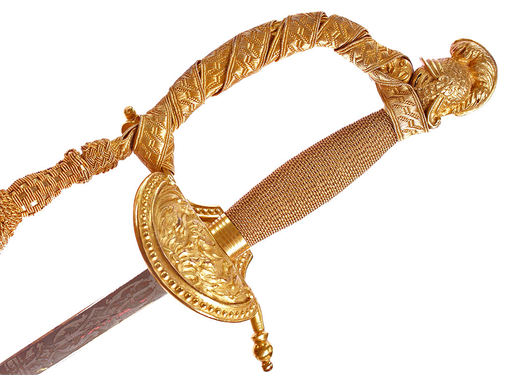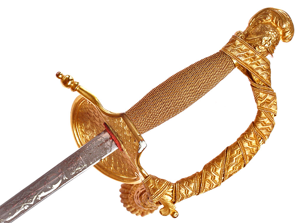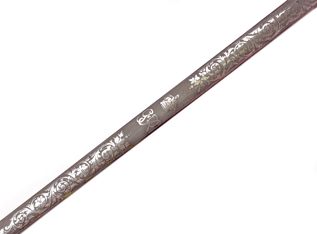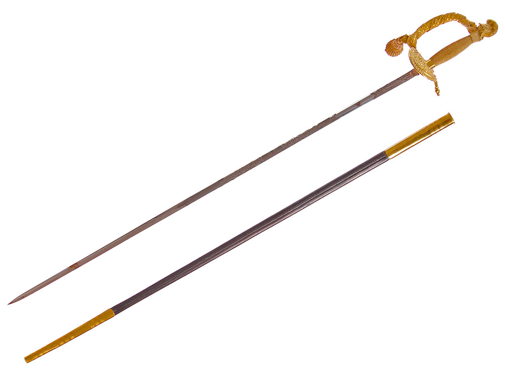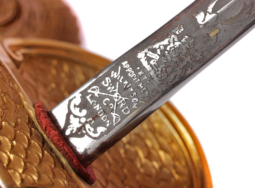 Шпага гражданского чиновника, изготовленная в период правления короля Георга VI. Клинок прямой, линзовидного сечения, примерно на две трети украшен травленым орнаментом. У основания - травленая надпись с данными изготовителя: "WILKINSON / SWORD / Co / LONDON". Рукоять деревянная, плотно обмотанная золоченой проволокой, с латунным золоченым прибором. Навершие трактовано в виде рыцарского шлема, дужка гарды завершается перекрестием. Щиток украшен рельефным изображением драконов. Ножны кожаные, с латунными золочеными устьем и наконечником. Оригинальный темляк из металлизированной золоченой нити.