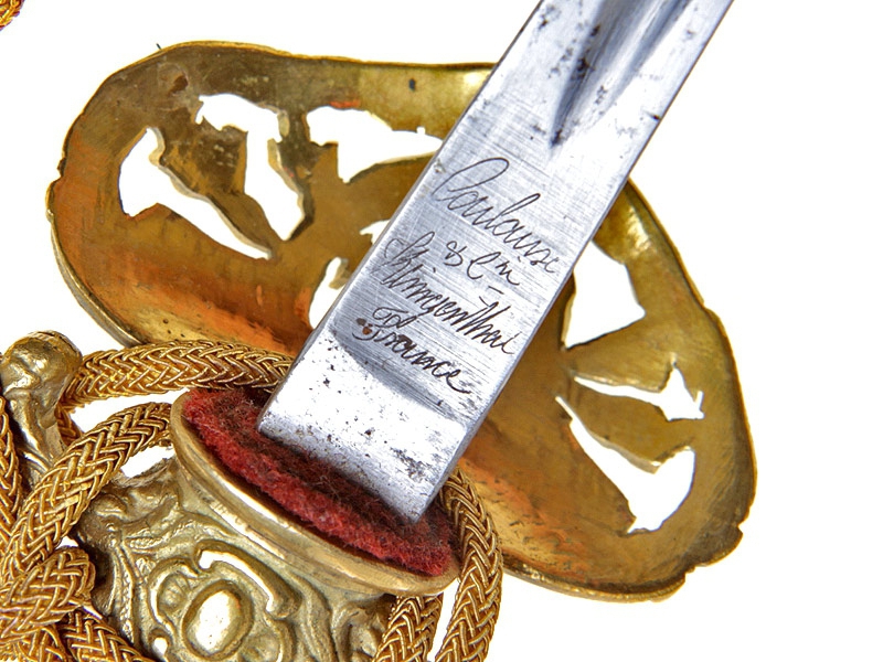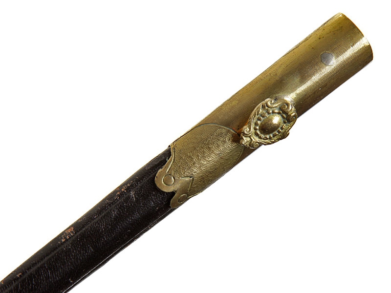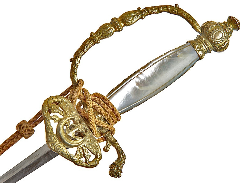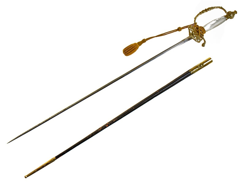 Шпага чиновников морской колониальной администрации образца 1852 года. Клинок трехгранный, у основания - гравированное клеймо "Coulaux & Cie, Klingenthal, France". Рукоять деревянная с перламутровыми накладками, прибор рукояти латунный вызолоченный. Золочение практически полностью сохранилось. Ножны кожаные, с золоченым прибором. Сохранился оригинальный темляк.
