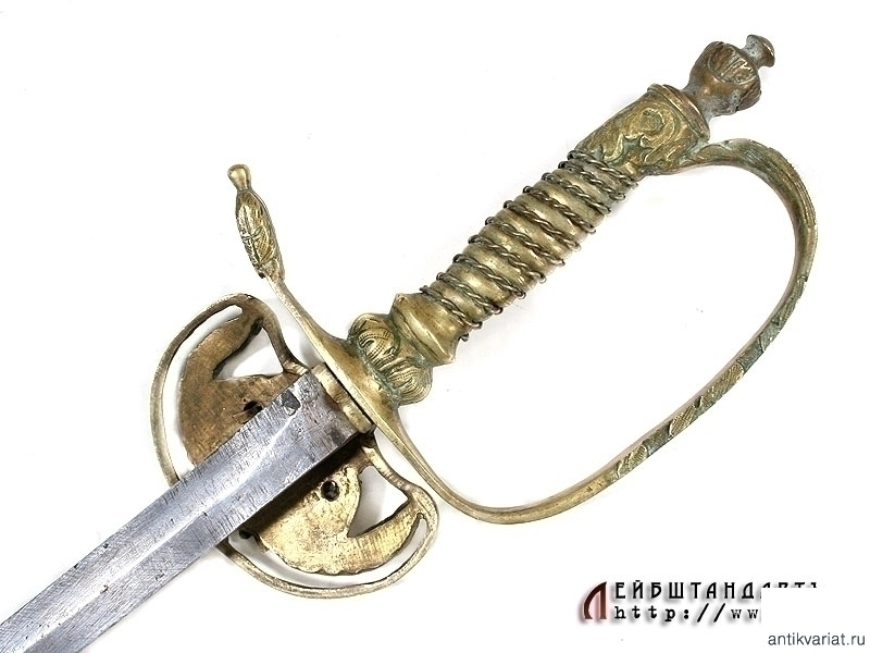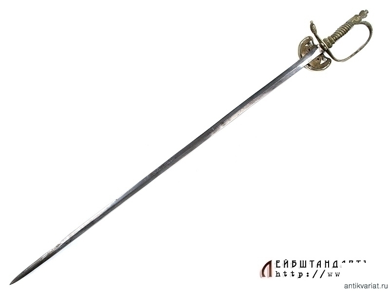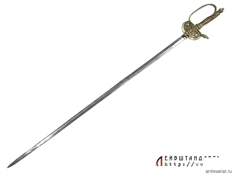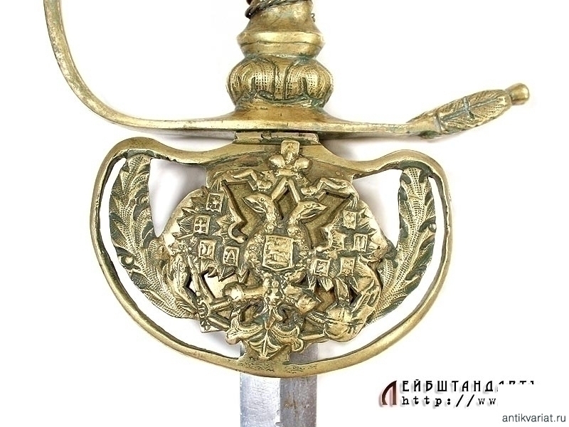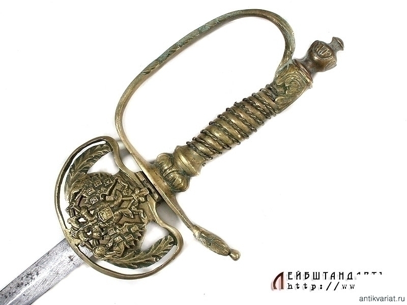 Парадная шпага чиновника государственной службы либо полиции в хорошем состоянии. Клинок без клейм, ромбического сечения. Рукоять бронзовая, перевитая по поперечным желобкам витой проволокой. Чашка гарды украшена накладным изображением государственного герба - двуглавого орла в венке. Ножны отсутствуют.