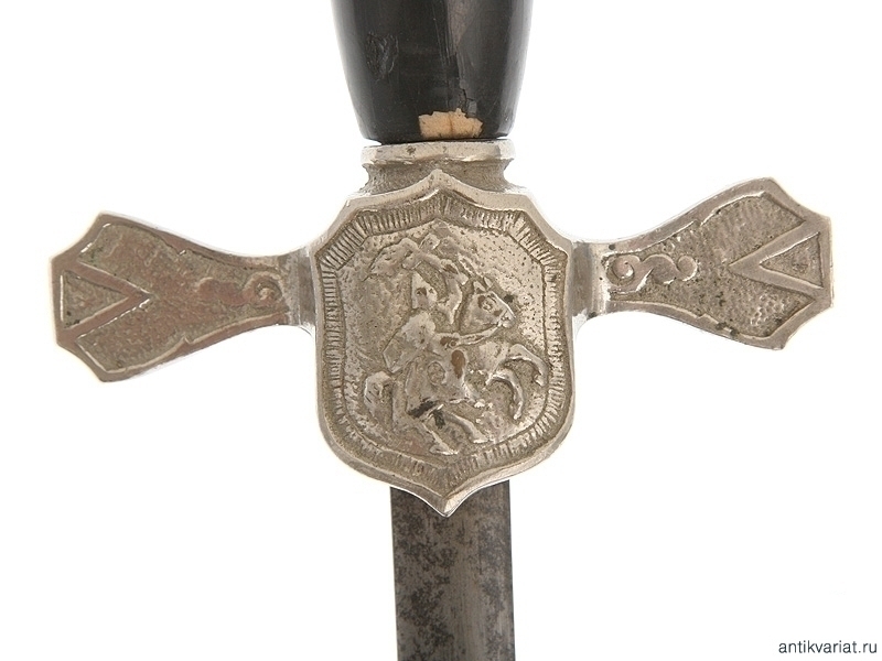 Деревянная рукоятка, окрашенная в черный цвет. Навершие трактовано в виде рыцарского шлема.