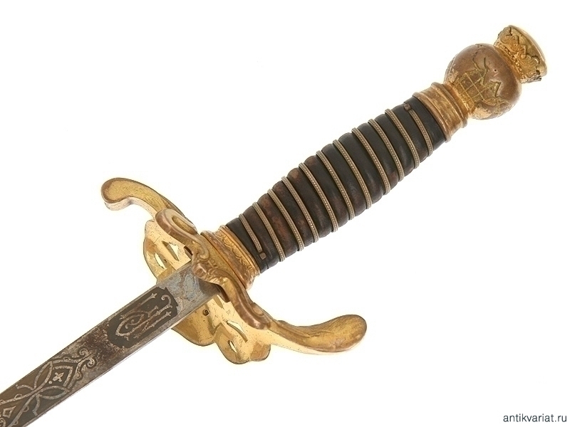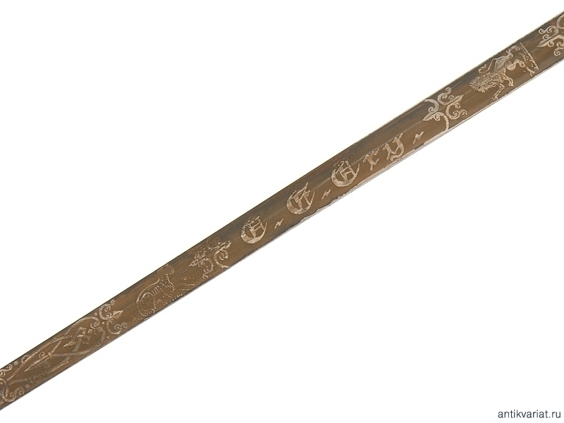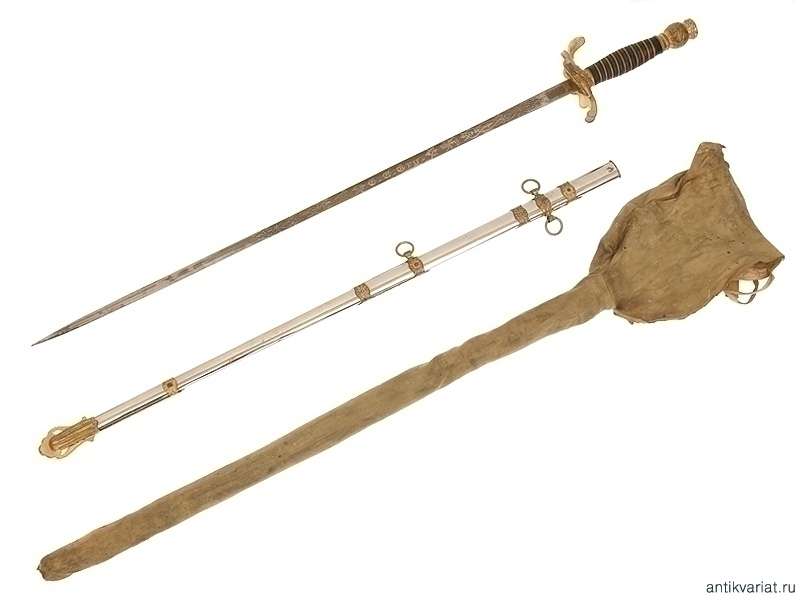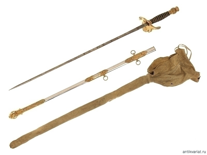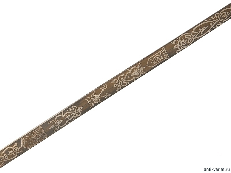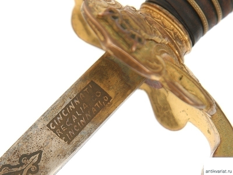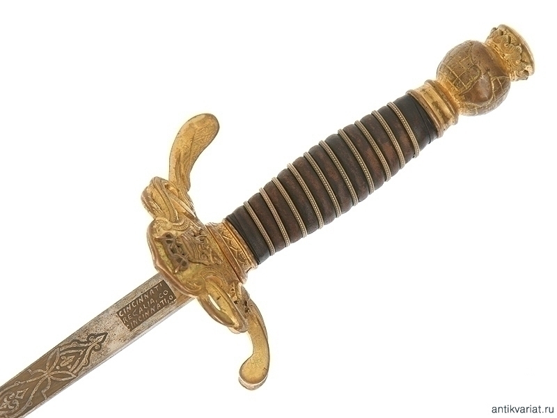 Ритуальная шпага масонского общества "Независимый орден нечетных товарищей", появившегося в США в начале 19 века. Данный тип шпаги имели право носить члены общества, находящиеся в звании "боевой старейшина". Клинок никелированный, украшен травлением: изображена различная масонская символика. Клинок маркирован клеймом "Cencinnati, Co Recalio, Co Cincinnati,o". Рукоять деревянная, обтянутая черной кожей, перевита по желобкам проволокой. Навершие трактовано в виде глобуса. Металлический прибор рукояти латунный позолоченный. Ножны металлические, с литыми фигурными устьем, гайкой и наконечником. Конец 19 века - начало 20 века. В комплект входит чехол.