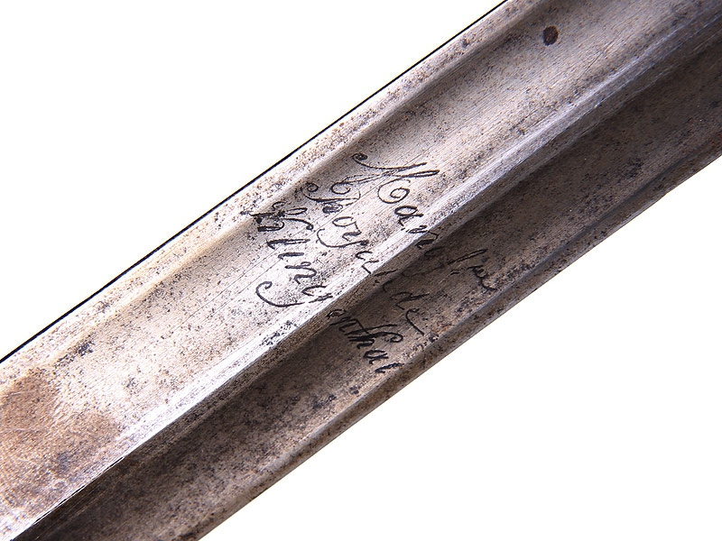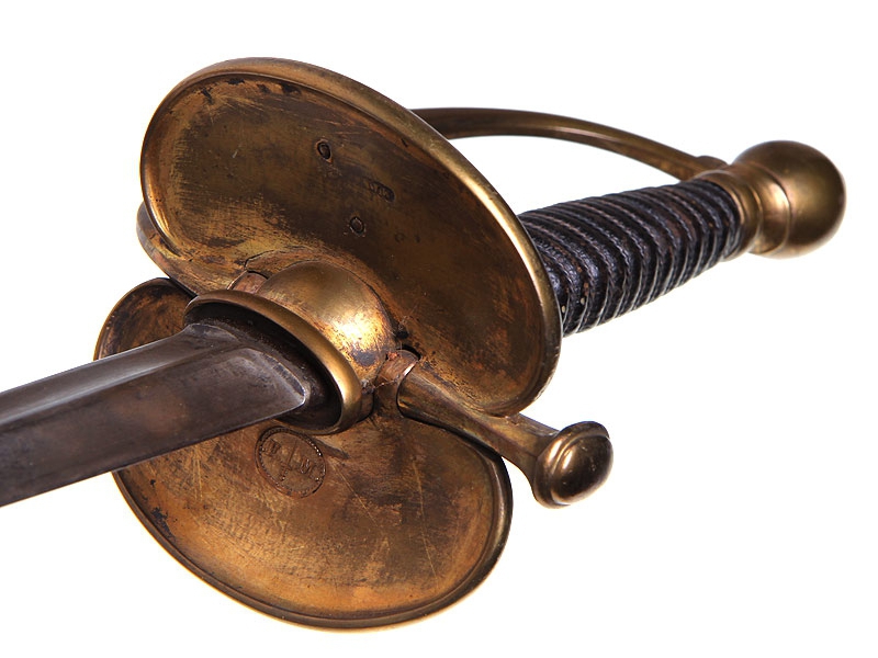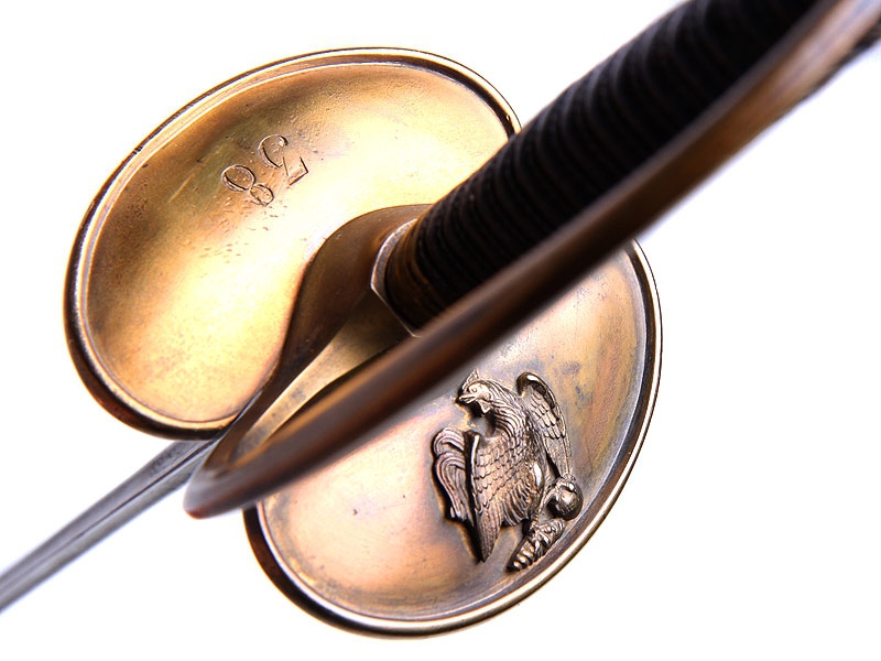 Шпага муниципальной гвардии образца 1830 года. Клинок с гравированной надписью "Королевская военная мануфактура в Клингентале". Рукоять из дерева, обмотана витой латунной проволокой, прибор рукояти латунный вызолоченный. Золочение почти полностью сохранилось. На гарде - рельефное изображение галльского петуха, с внутренней стороны гарда изготовлена складной для удобства ношения, на ней выгравирован номер "38". Ножны отсутствуют.