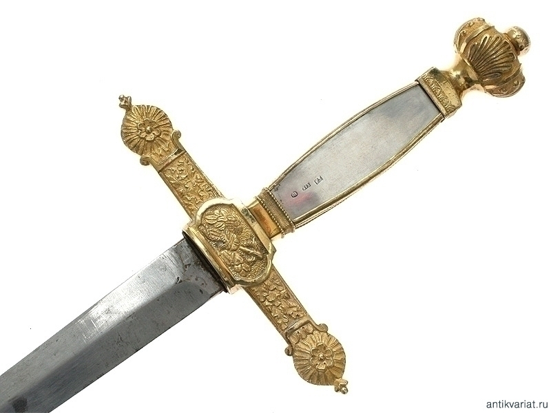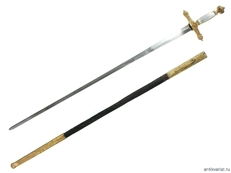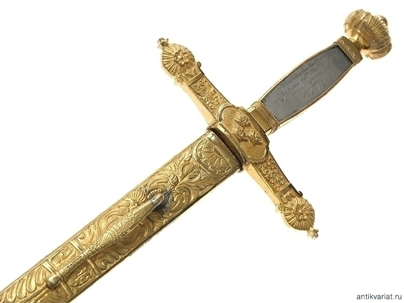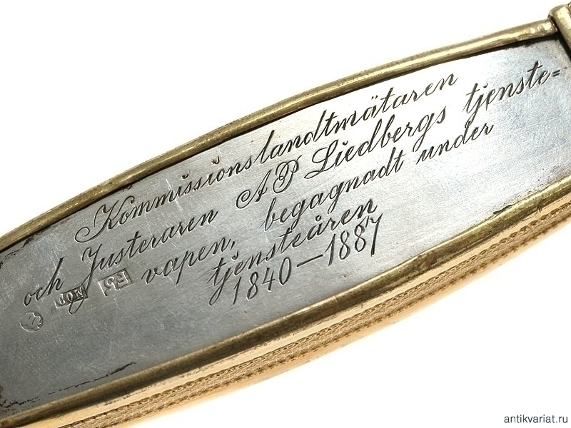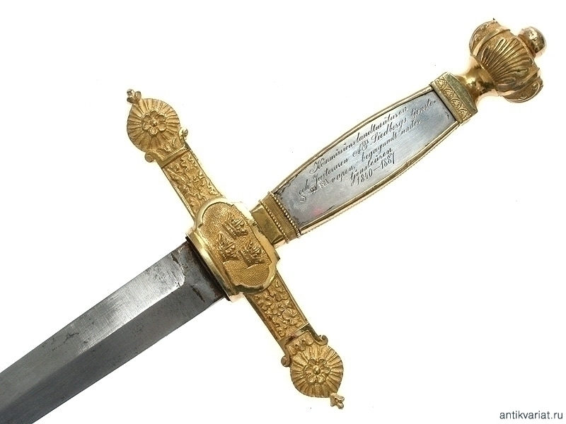 Шпага чиновничья в очень хорошей сохранности. Клинок без клейм. Рукоять с серебряными вставками, на лицевой пластине нанесена дарственная надпись, датированная 1887 годом. Металлический прибор изготовлен из позолоченной бронзы. Перекрестие эфеса украшено изображением трех корон. Ножны кожаные, с латунным вызолоченным прибором.