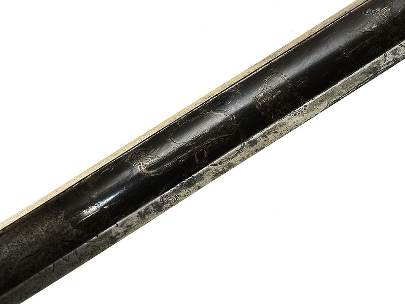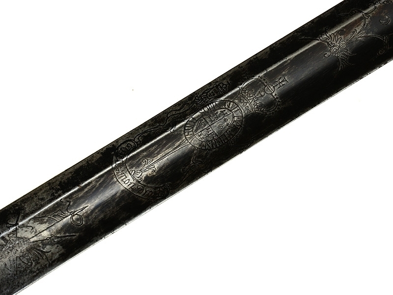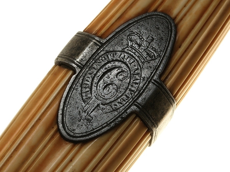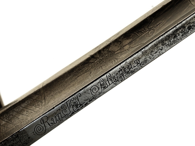 Шпага-эспадрон офицера пехоты образца 1786 года. Клинок на треть украшен геральдической гравировкой и покрыт синением, на обухе клинка - гравированная надпись "JJ Runkell Solingen" (Джон Рункель во время Наполеоновских войн был главным импортером немецких клинков для британской армии и работал в Лондоне). Рукоять из слоновой кости со стальным прибором. Ножны отсутствуют.