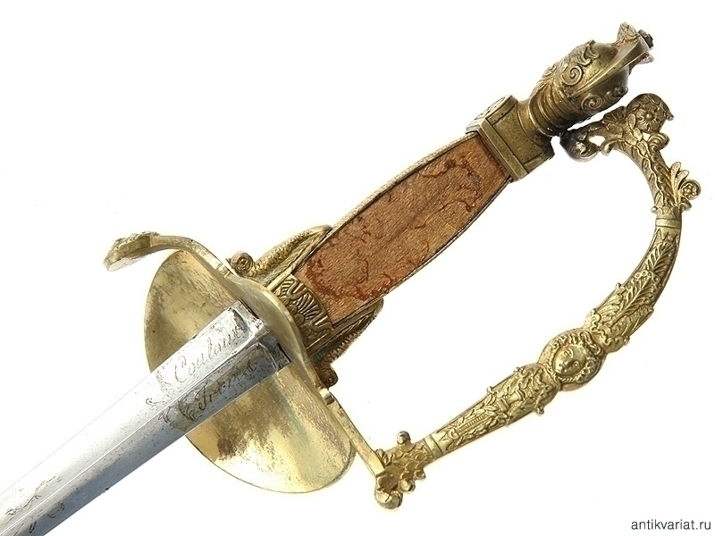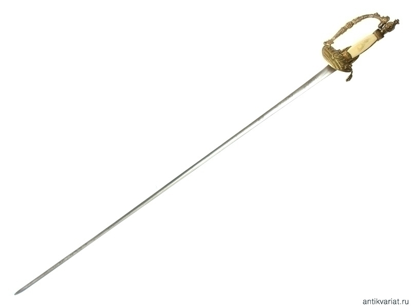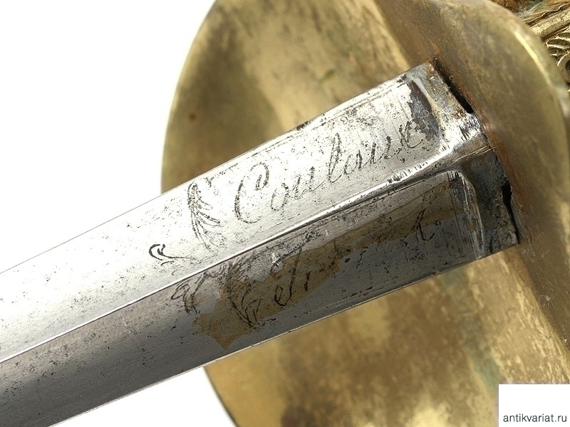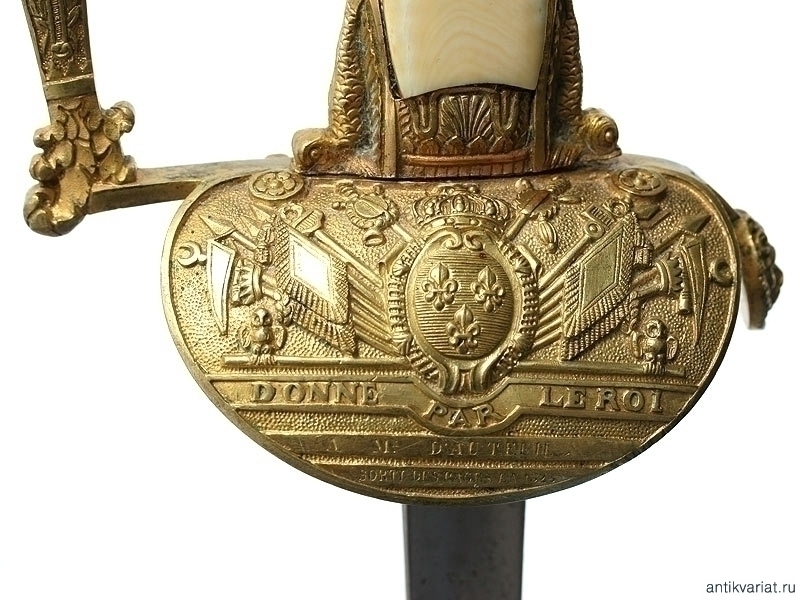 Шпага офицеров военно-медицинской службы периода Второй империи. Клинок украшен гравированным орнаментом, у основания - надпись "Coulaux Freres". Рукоять изготовлена и декорирована в стиле "ампир". Металлический прибор изготовлен из бронзы, частично сохранилось оригинальное золочение. Чашка гарды украшена Королевской эмблемой в виде трех лилий в окружении знамен и военной арматуры. В нижней части чашки - рельефный девиз "Donne par le Roi", под которым помещена гравированная надпись: "A. M. D'Auteuil, Sorti Des Pages" с датой - 1823 год. Щечки рукояти из слоновой кости, одна из накладок отсутствует. Ножны отсутствуют.