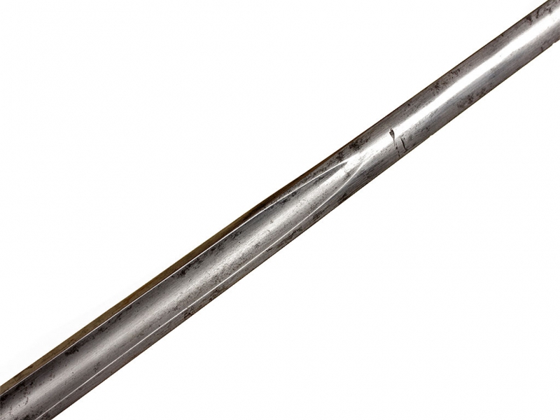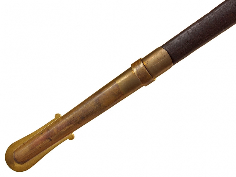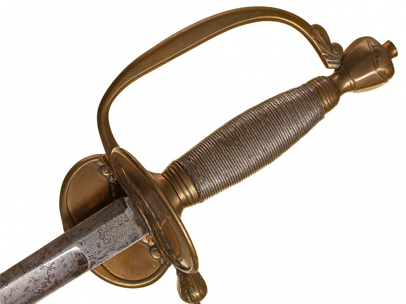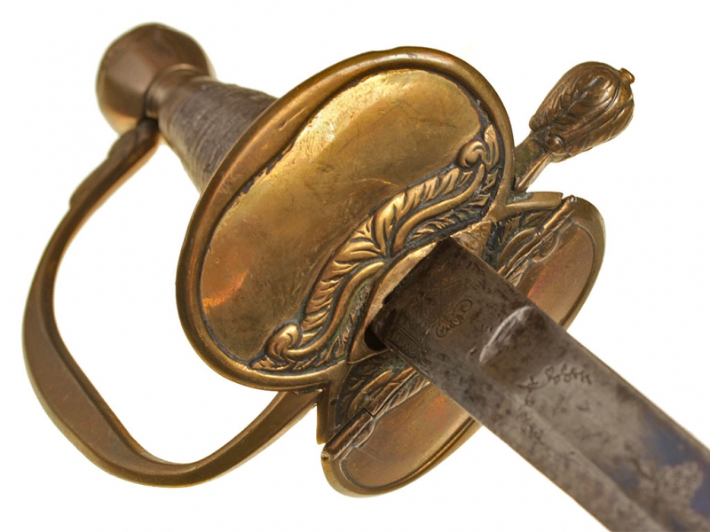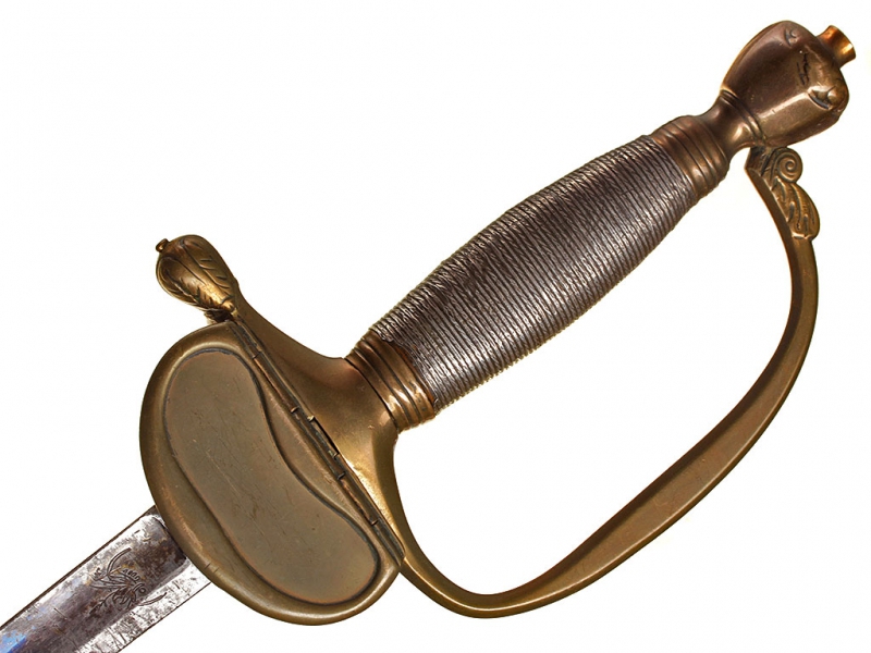 Пехотная офицерская шпага образца 1796 года. Клинок украшен гравированным орнаментом на синем фоне. Рукоять оплетена витой серебряной проволокой, с бронзовым золоченым прибором. Чашка гарды с внутренней стороны сделана складной для удобства ношения. Ножны кожаные, с латунным прибором.