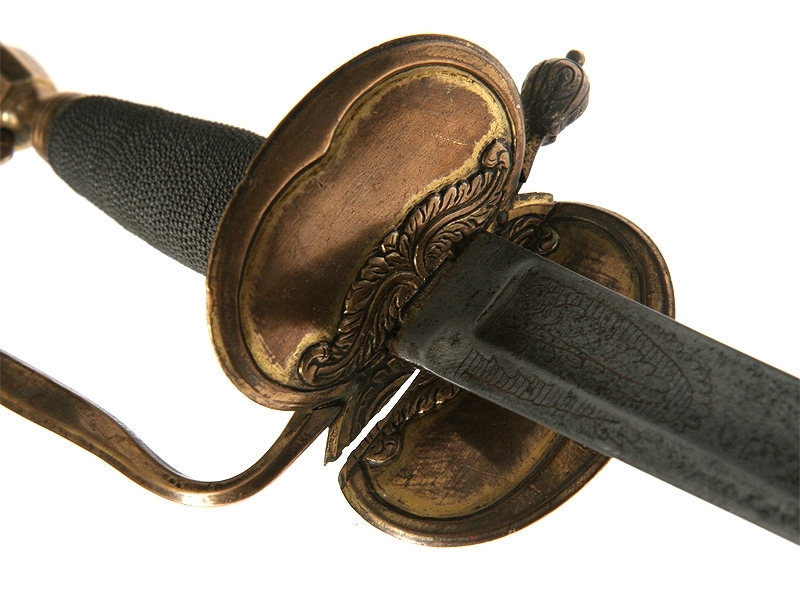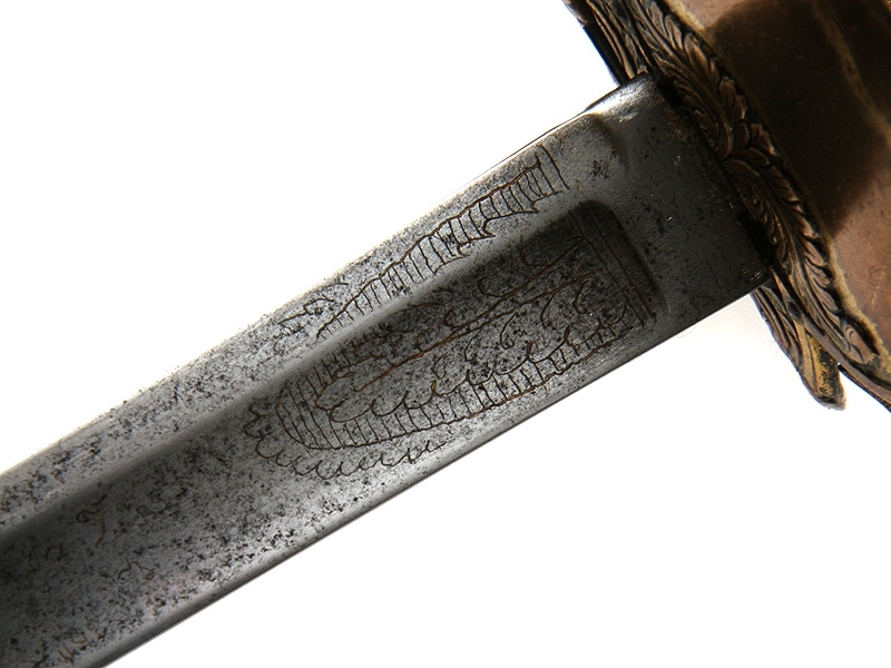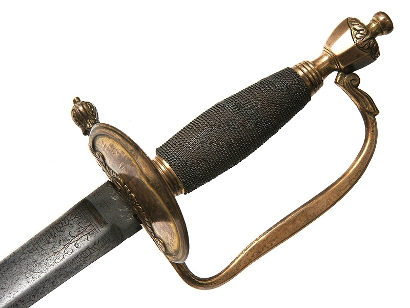 Пехотная офицерская шпага образца 1796 года. Клинок украшен гравированным вензелем короля Георга III и гербом Англии. Рукоять оплетена витой проволокой, с бронзовым золоченым прибором. Чашка гарды с внутренней стороны сделана складной для удобства ношения. Ножны отсутствуют.