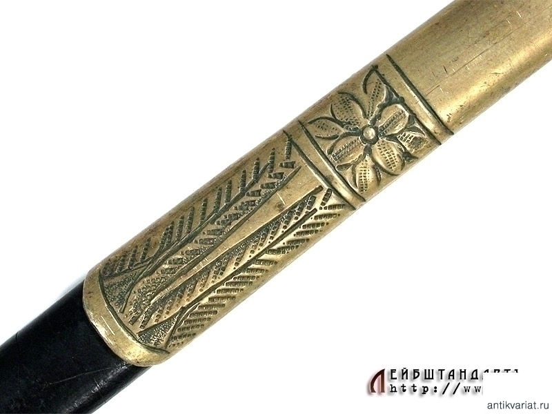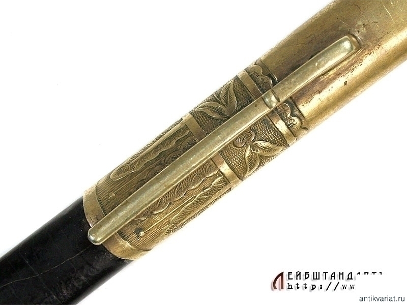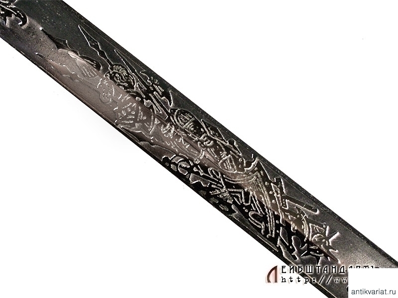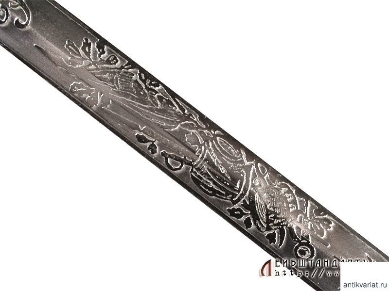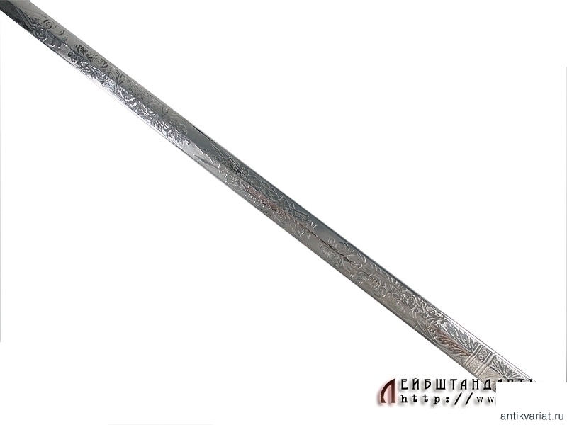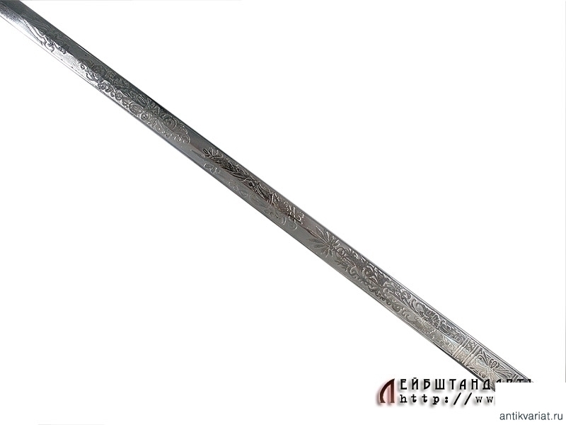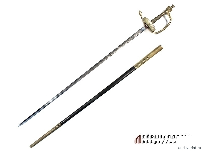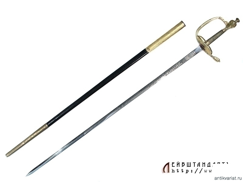 Шпага в очень хорошем коллекционном состоянии, с заказным клинком, у основания которого присутствует клеймо фирмы "С.K. & Co.". Клинок до половины украшен травлением с изображением военной арматуры в окружении растительного орнамента, никелированный. Рукоять деревянная, обмотанная витой проволокой. Металлический прибор изготовлен из позолоченной бронзы. Чашка эфеса складная, что сделано для удобства ношения. Ножны деревянные, покрыты толстым слоем черного блестящего лака, с латунным вызолоченным прибором. Отличный образец с заказным клинком.