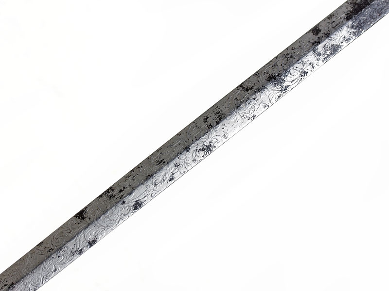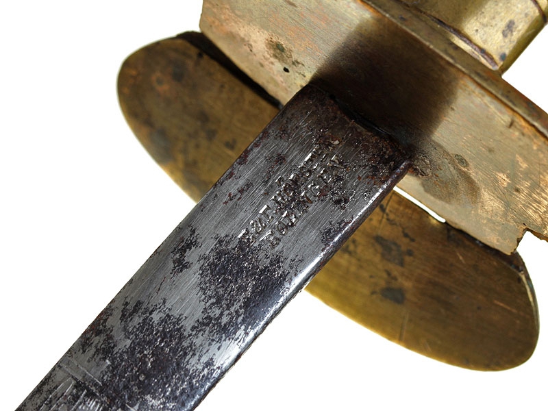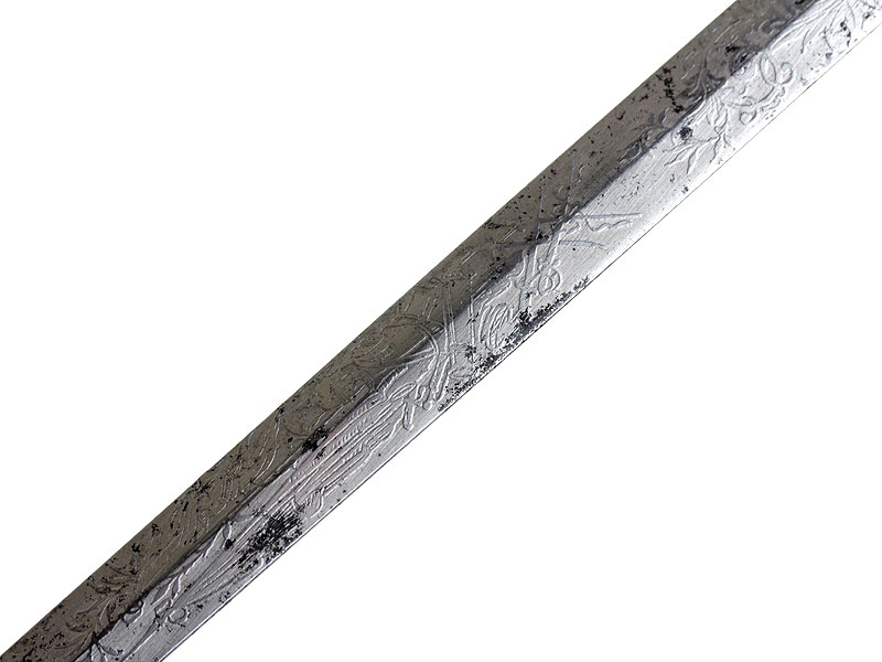 Шпага офицерская пехотная образца 1798 года - самый последний, 3-й тип данного образца. С заказным клинком, у основания которого присутствует клеймо фирмы "Hoerster". Клинок почти до половины украшен травлением с изображением военной арматуры в окружении растительного орнамента, никелированный. Имеются незначительные следы коррозии. Рукоять деревянная, обмотанная витой медной проволокой. Металлический прибор изготовлен из позолоченной бронзы, золочение почти полностью сохранилось. Чашка эфеса складная, что сделано для удобства ношения. Ножны отсутствуют.