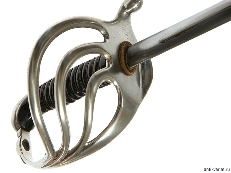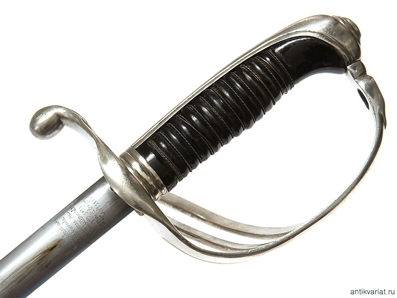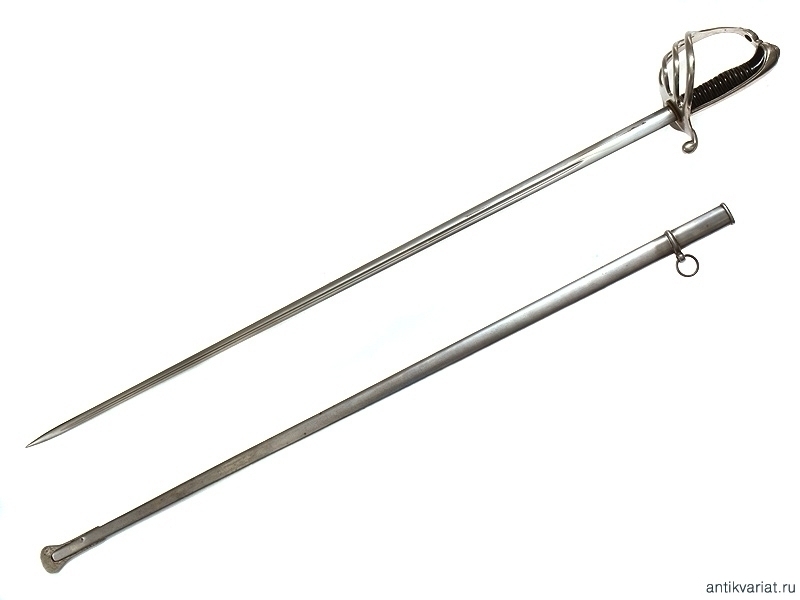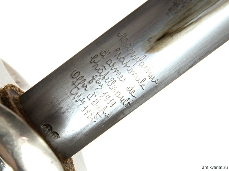 Пехотная офицерская шпага образца 1882 года. Клинок с надписью "Manufacture Nationale d"armes de Chatelleraut 8bre 1919 Offer de Infrie Mle 1882". Рукоять из черного рога, эфес мельхиоровый. Ножны металлические. Очень хорошее состояние.