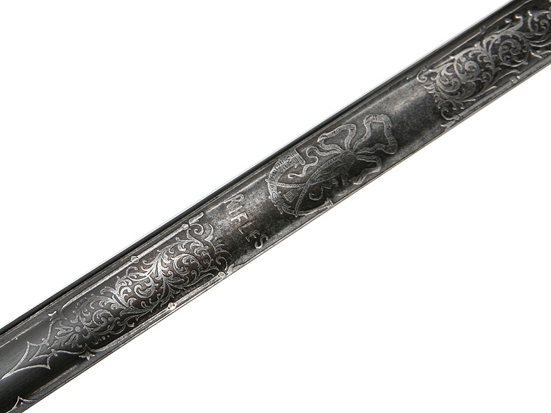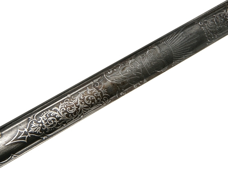 Офицерская пехотная шпага образца 1895/1897 года в очень хорошем состоянии. Клинок однолезвийный от середины до острия, с одним долом в верхней половине. У пяты с внешней стороны - поверочное клеймо. Клинок до середины украшен травленым растительным орнаментом. Эфес образован рукоятью и гардой. Рукоять деревянная, покрыта шероховатой кожей и обмотана по желобкам проволокой. Спинку рукояти покрывает стальная рифленая планка, плавно переходящая в полукруглую ступенчатую головку с пуговкой. Внизу на рукояти стальная втулка. Гарда представляет собой широкую ассиметричную чашу, украшенную растительным орнаментом и королевским вензелем. В верхней части гарды прорезь для темляка. Ножны металлические, обтянуты коричневой кожей, с подвесом. Начало XX века.